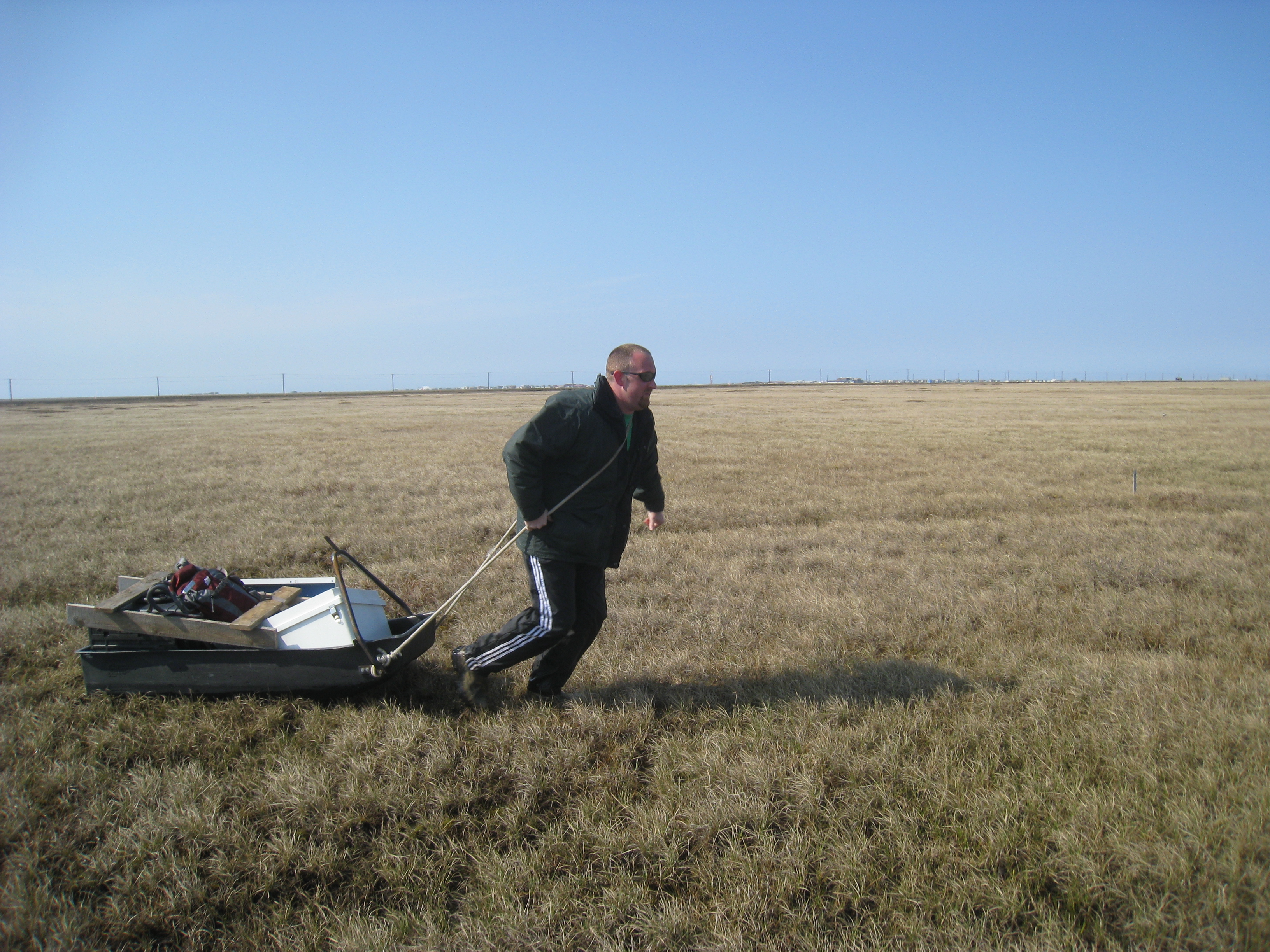 Jim Miller pulls a sled with over 100 pounds of equipment across the tundra. Barrow, Alaska.