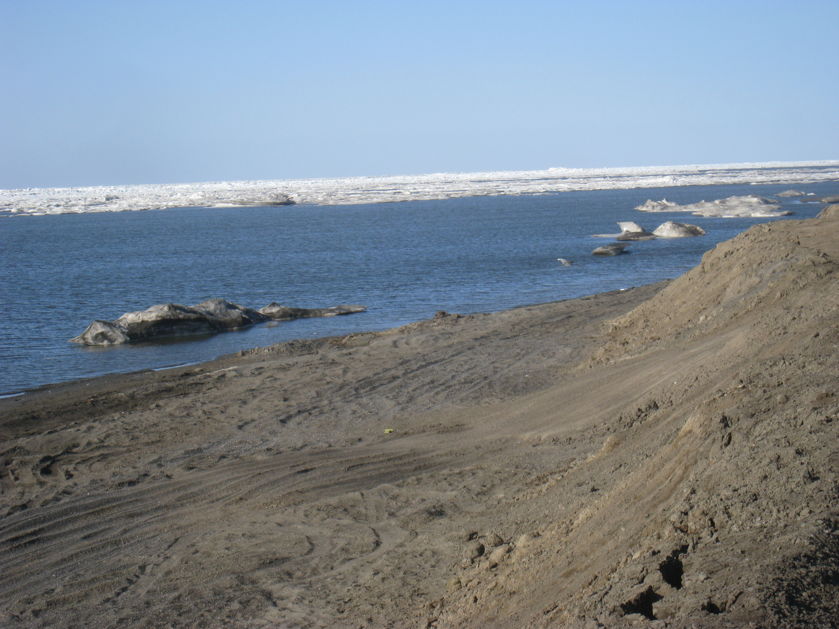 A beach with sea ice in the background, in Barrow, Alaska.