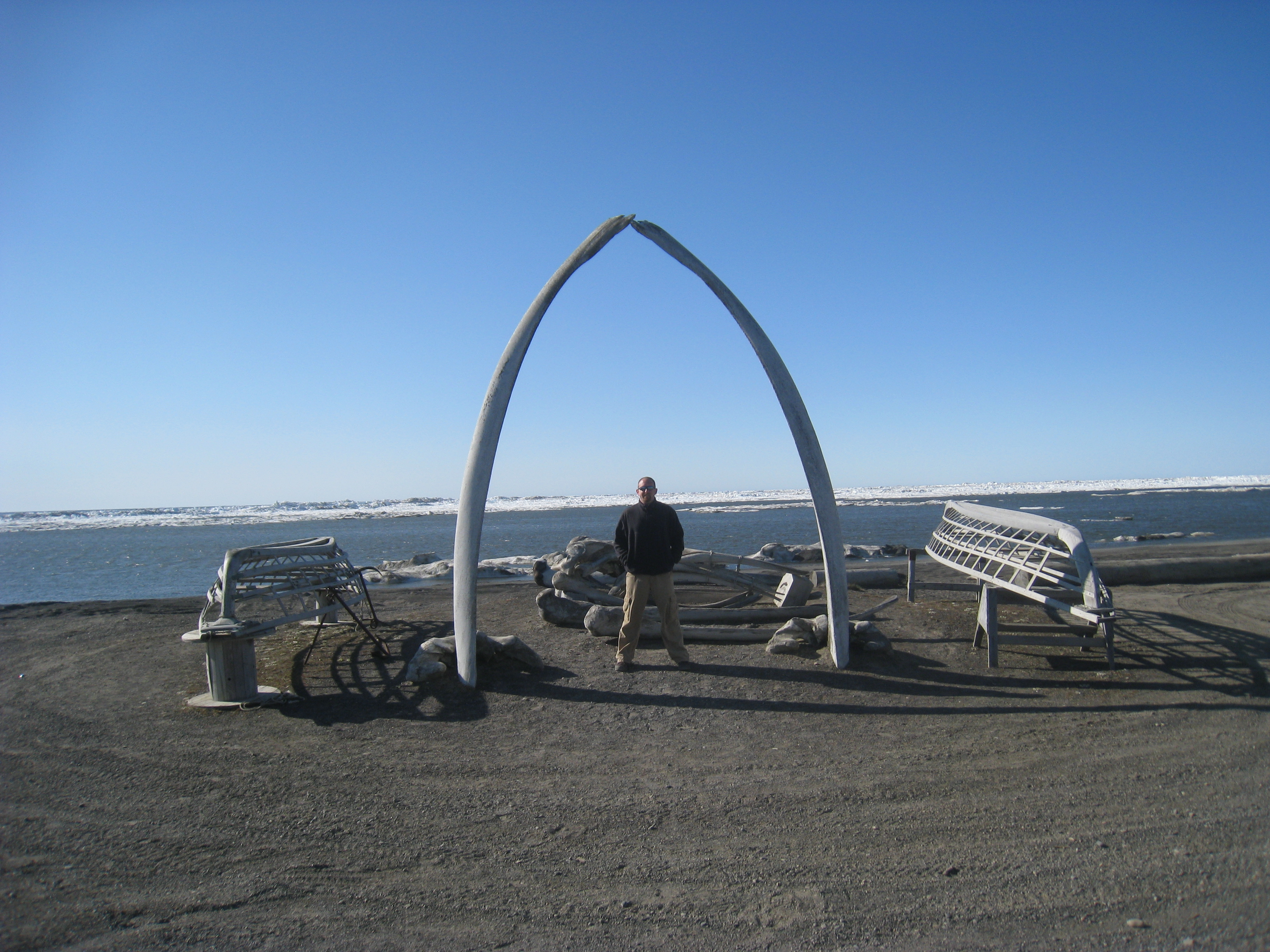 This whale bone arch is in the center of the town of Barrow, Alaska, overlooking the Arctic Ocean. Two whaling boats are on each side. Barrow, Alaska.