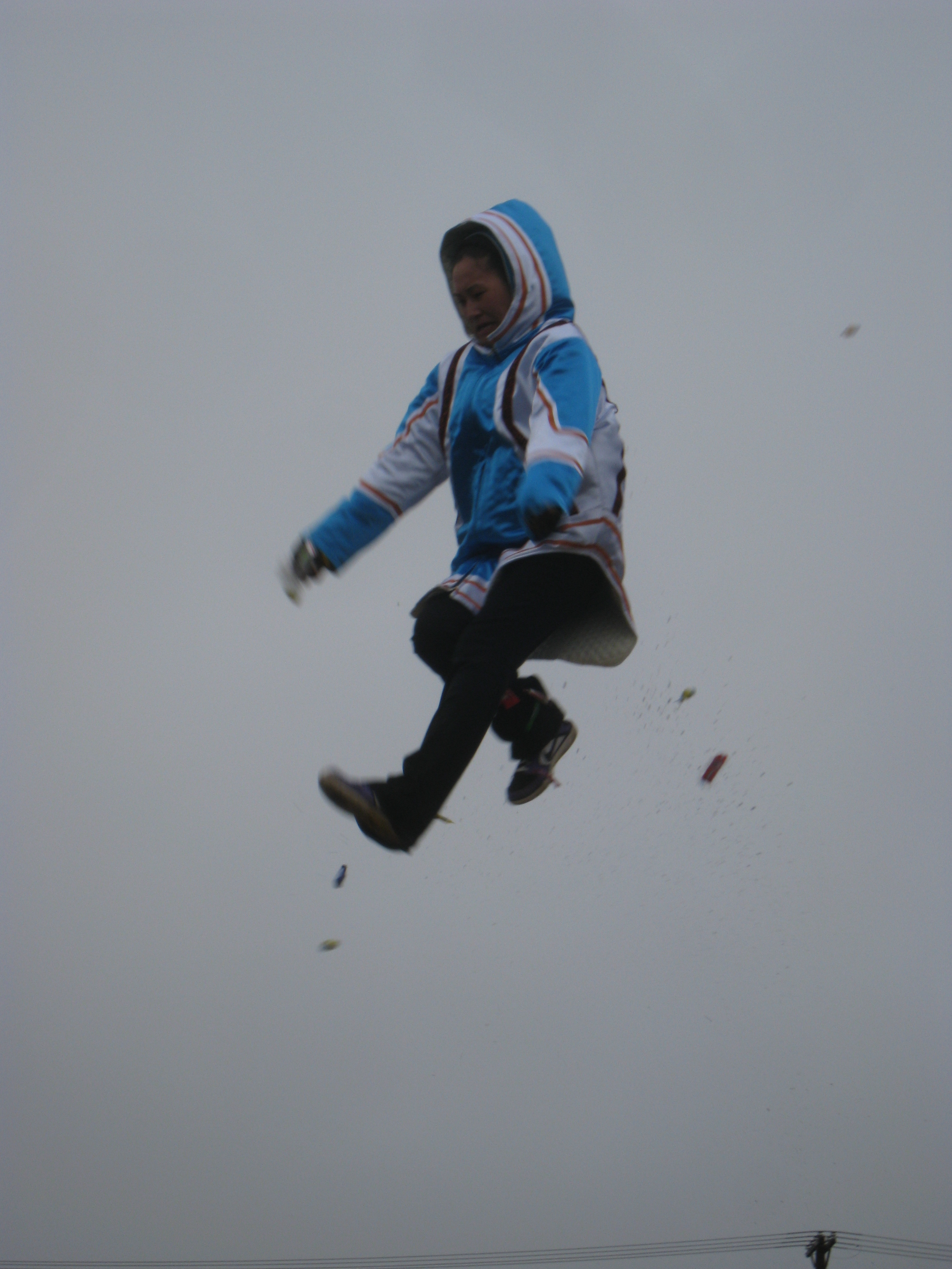 A whaling crew member's wife at the height of the blanket toss. She throws candy to the crowd. Barrow, Alaska.
