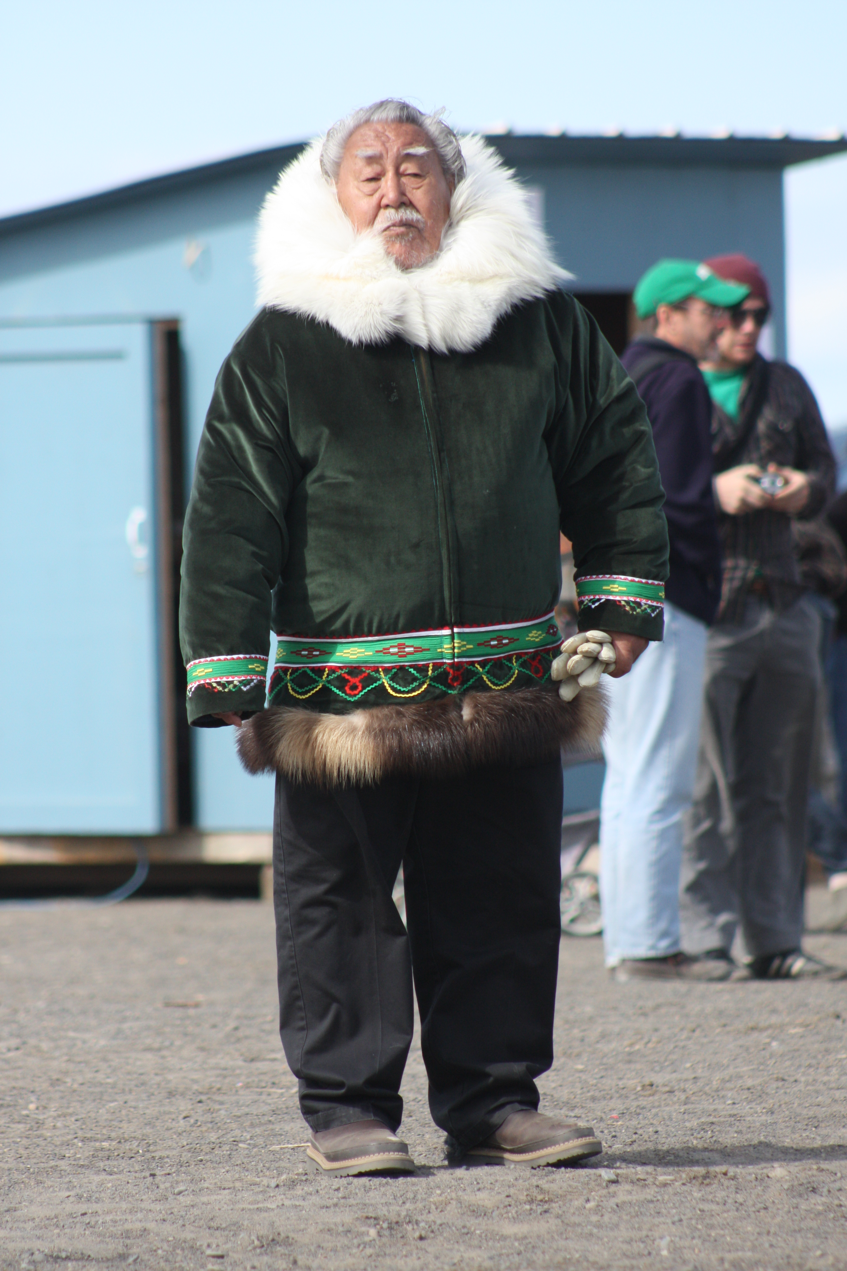 An Iñupiaq elder in his native apparel who participated in the rock juggling. Barrow, Alaska.
