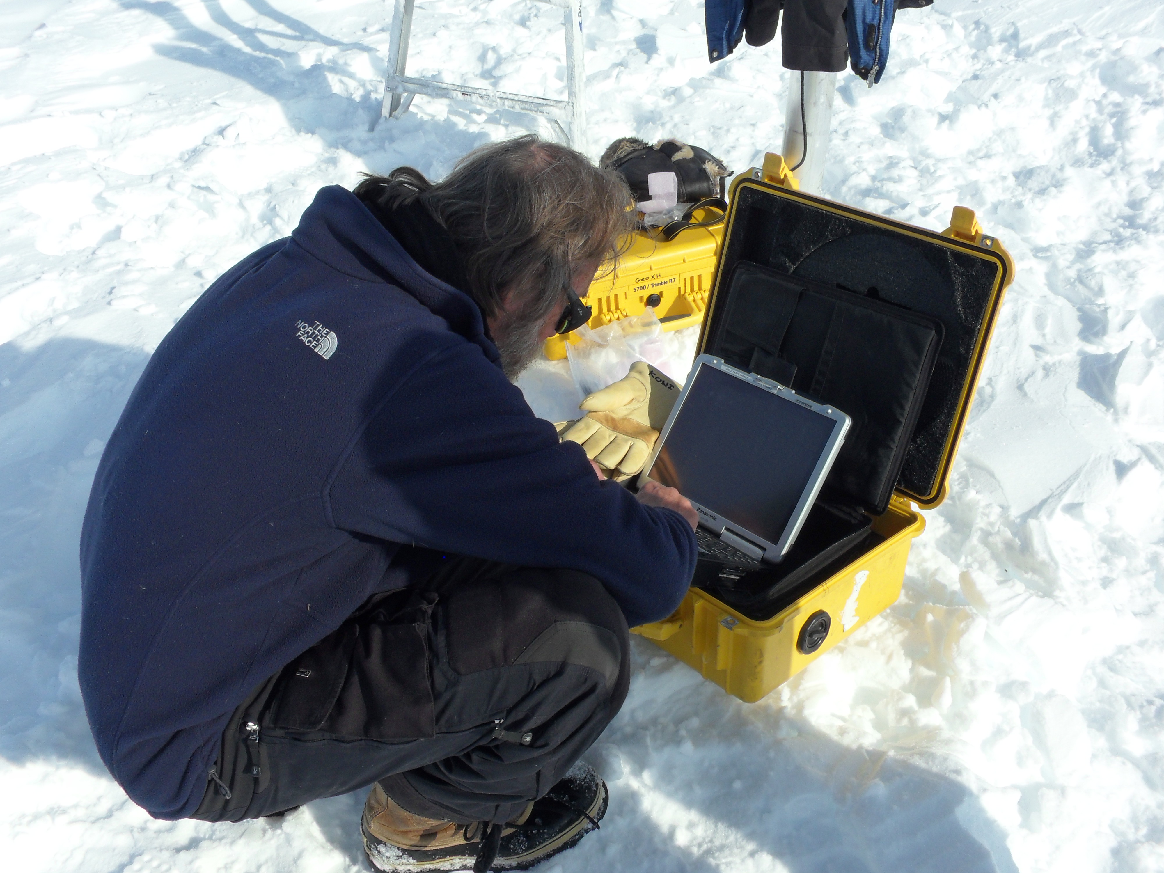 Dr. Konrad Steffen checks the data logger and instruments on the AWS (Automatic Weather Station). On the Greenland Ice Sheet.