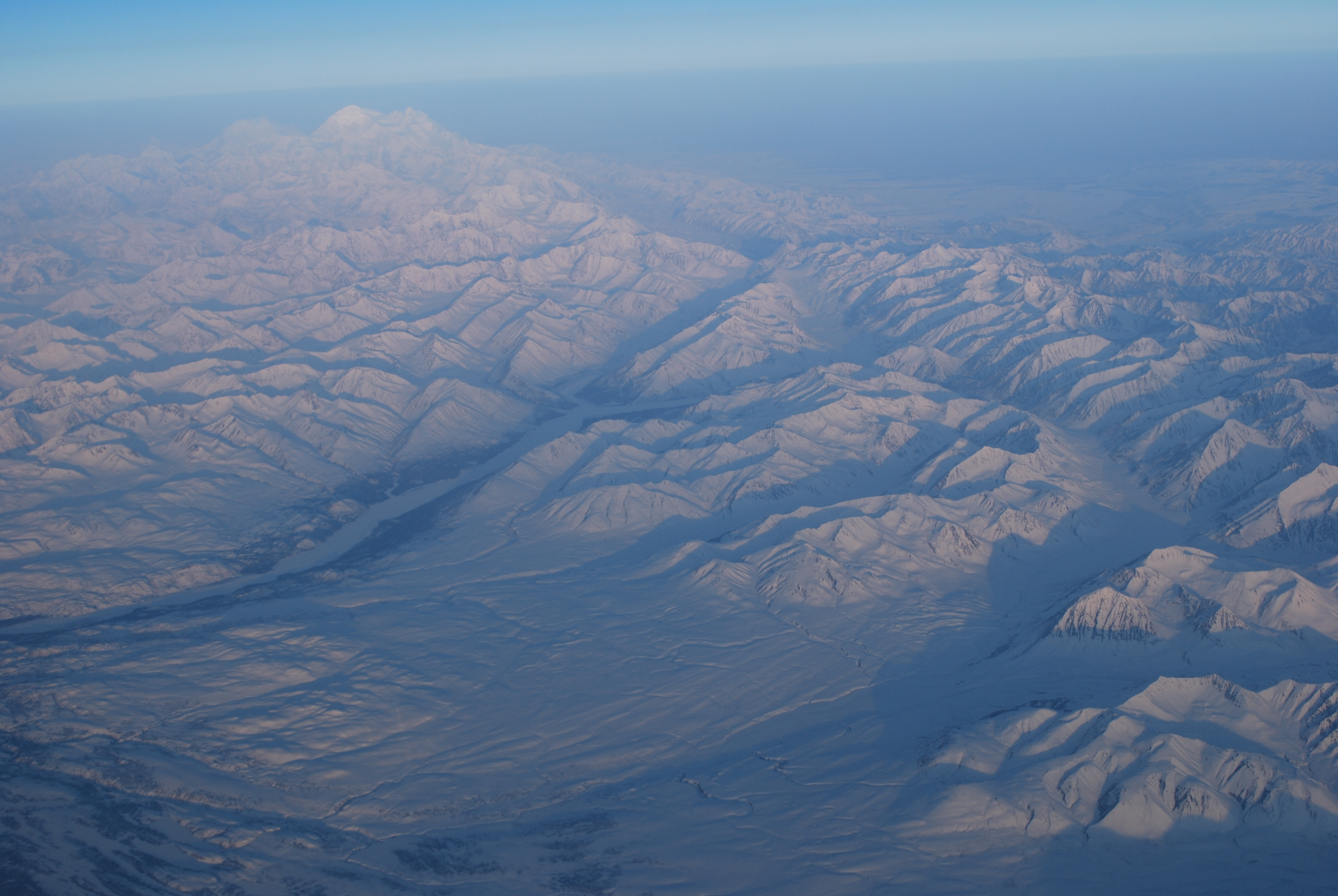 A view out of the plane of Denali and the Alaska Range. In an airplane on the way to Fairbanks, Alaska.