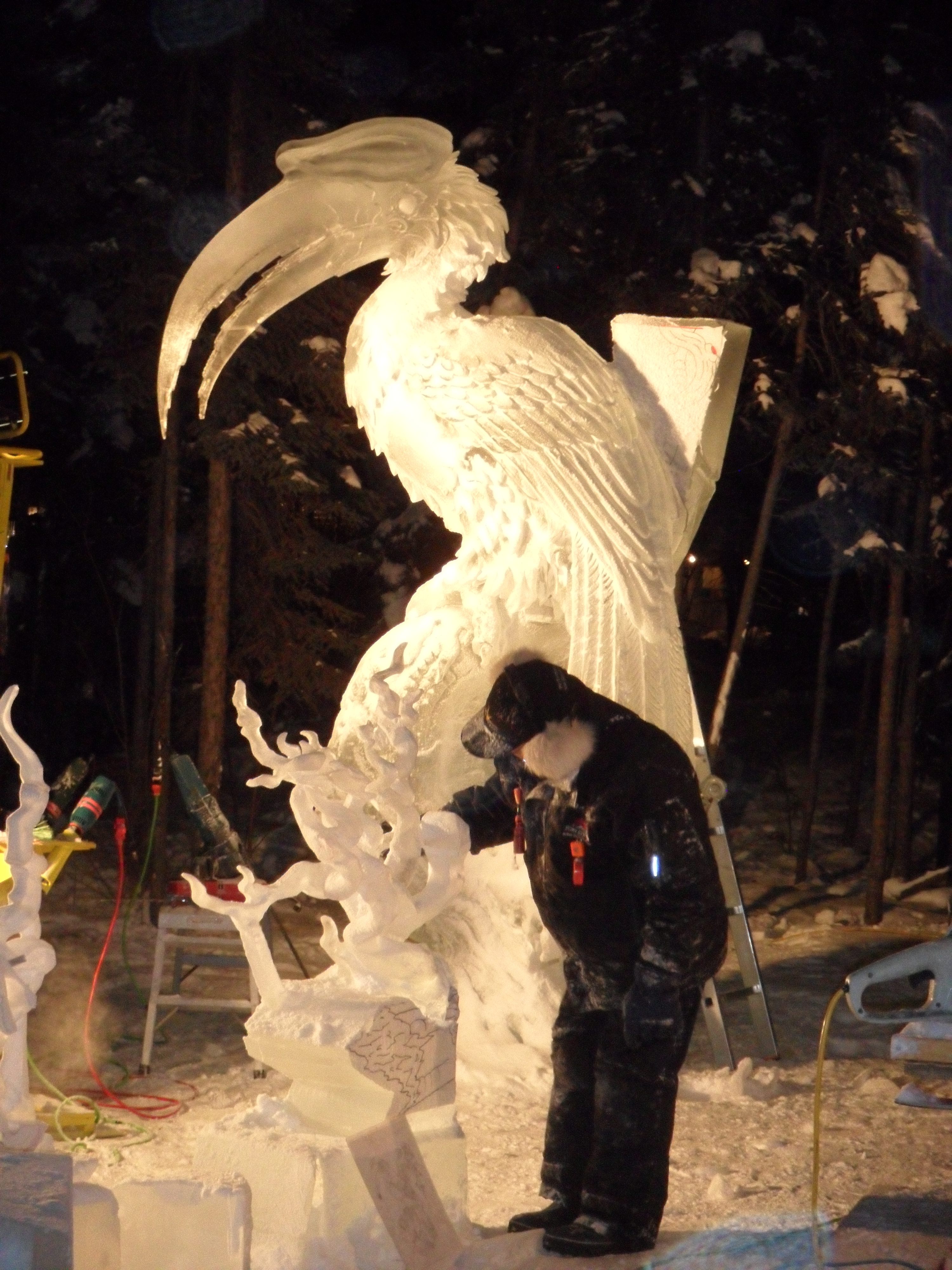 A bird ice sculpture being worked on at the World Ice Art Championships in Fairbanks, Alaska.