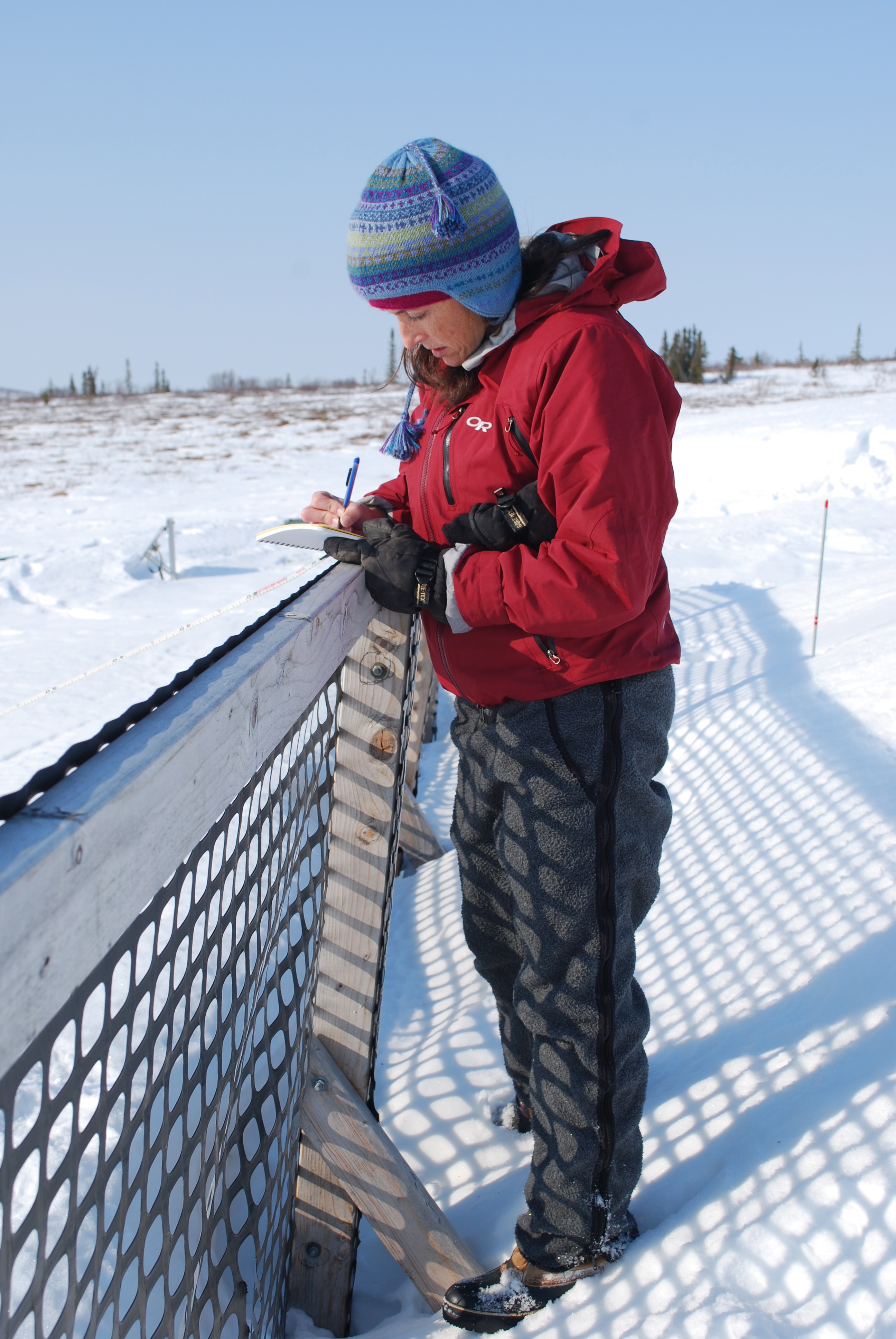 Dr. Susan Natali and Caitlin began by taking snow depth measurements at the snow fence. Healy, Alaska.