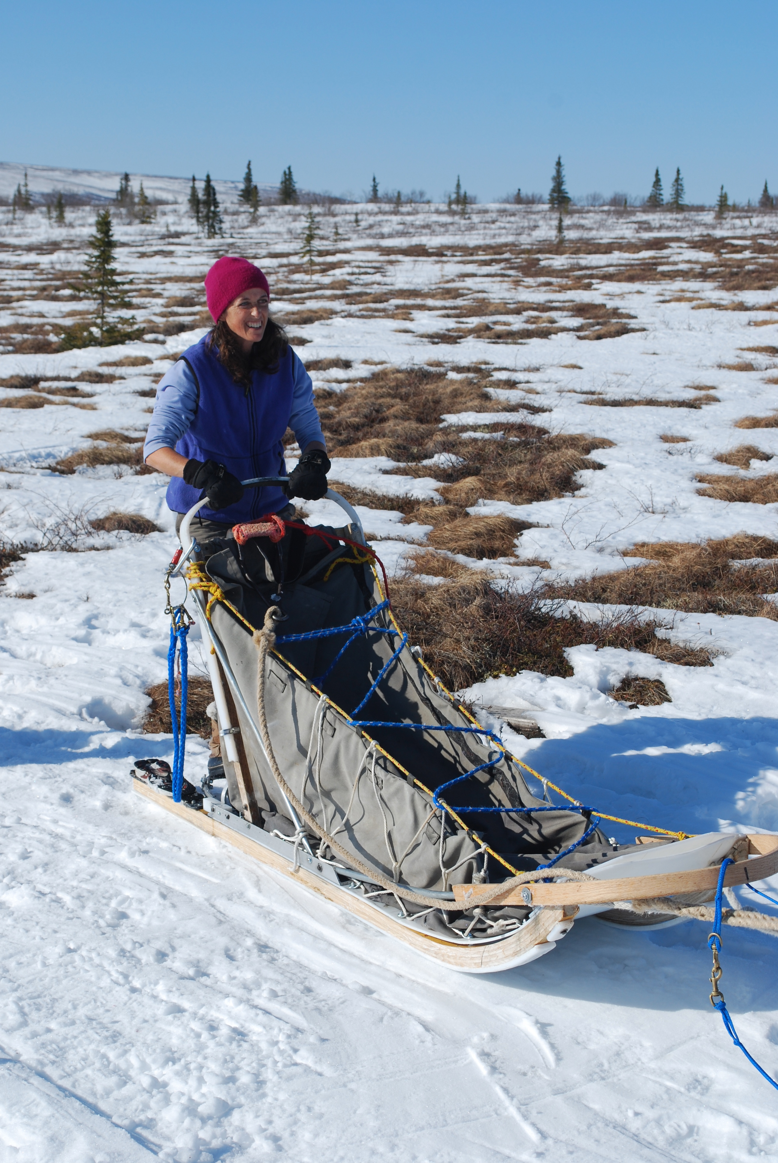 Dr. Susan Natali takes off in the morning on her dog sled. Healy, Alaska.