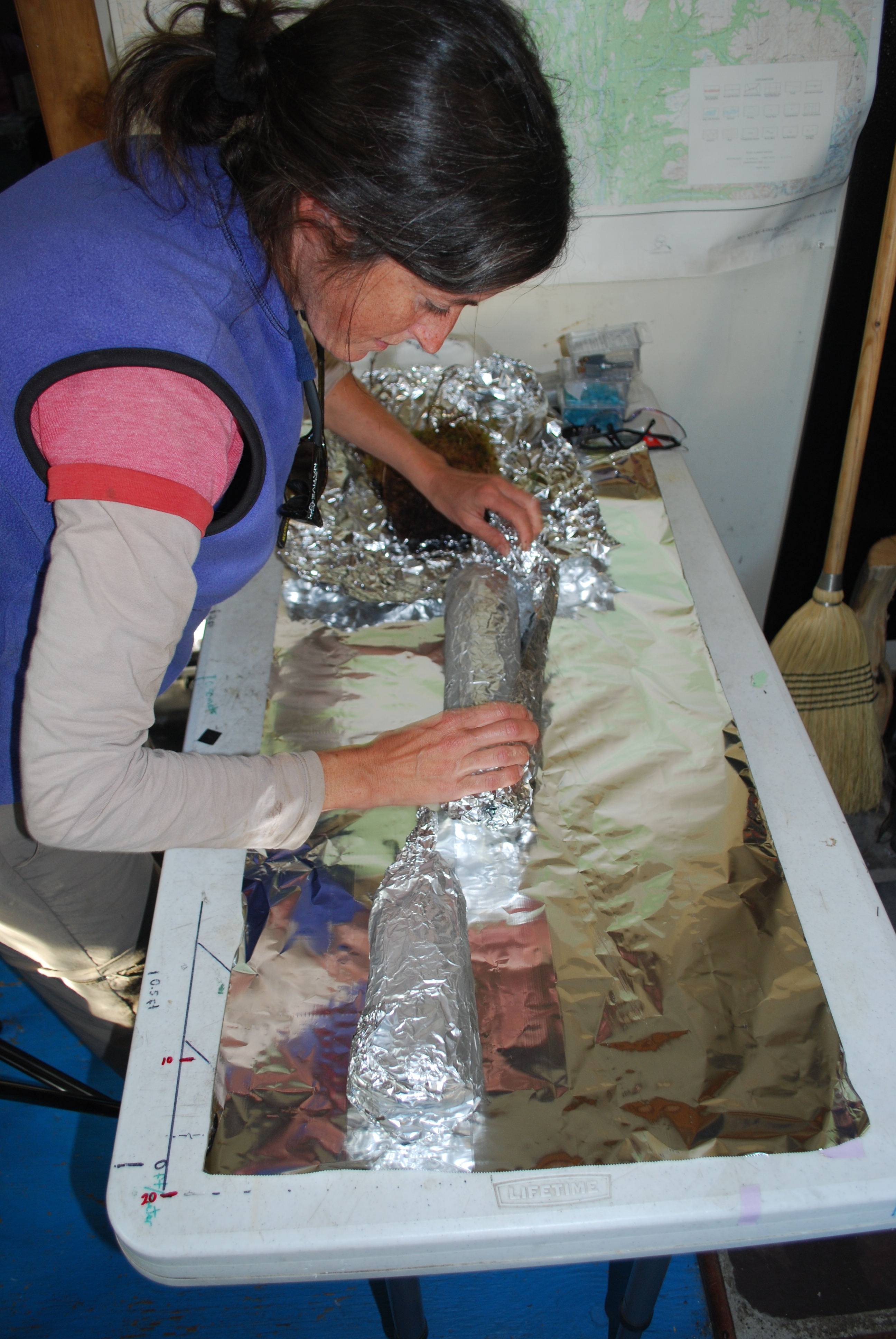 Dr. Susan Natali unwraps a frozen core sample. Healy, Alaska.