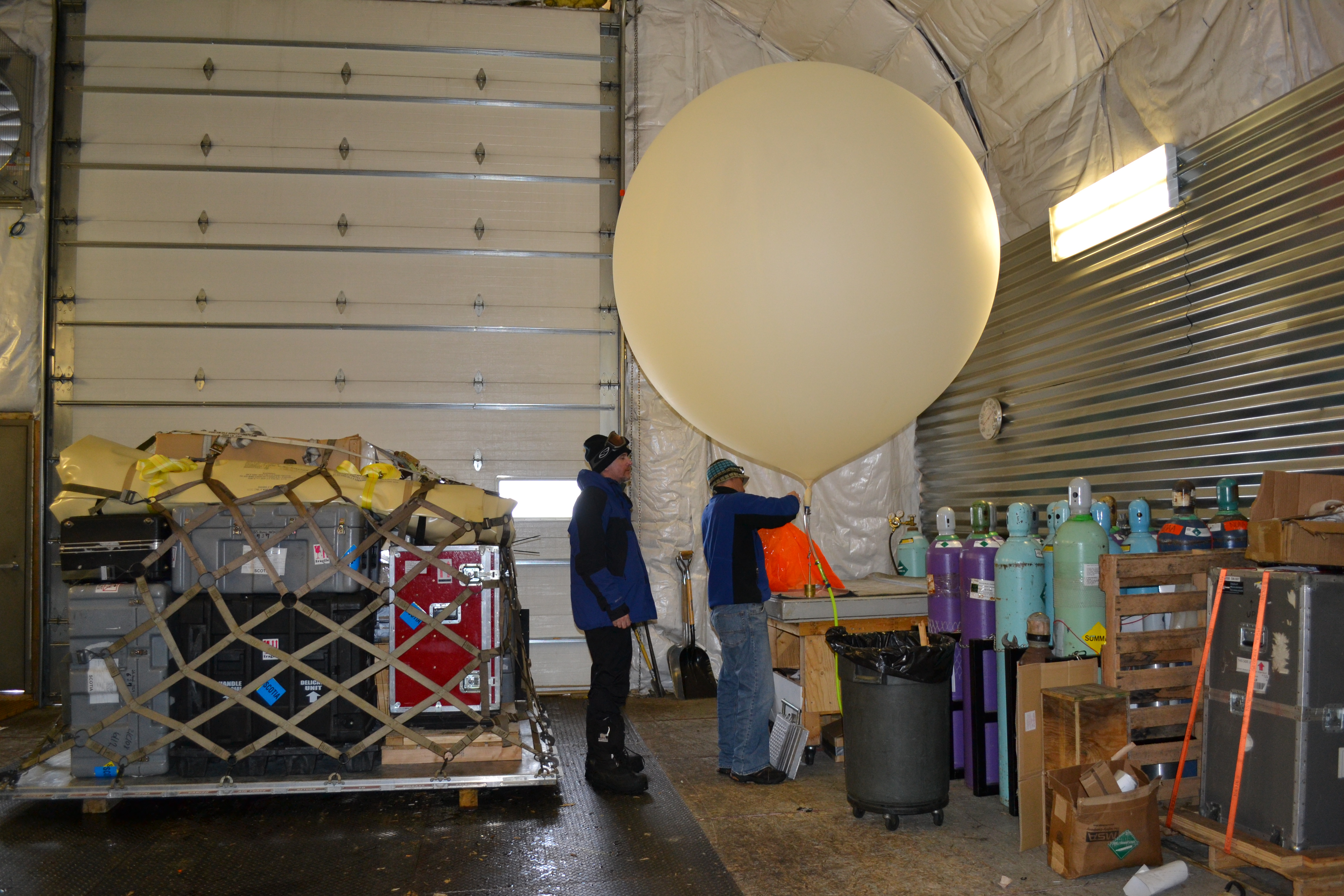 Kevin McMahon and Lance Roth watch the ozone balloon fill with helium. Summit Station, Greenland.