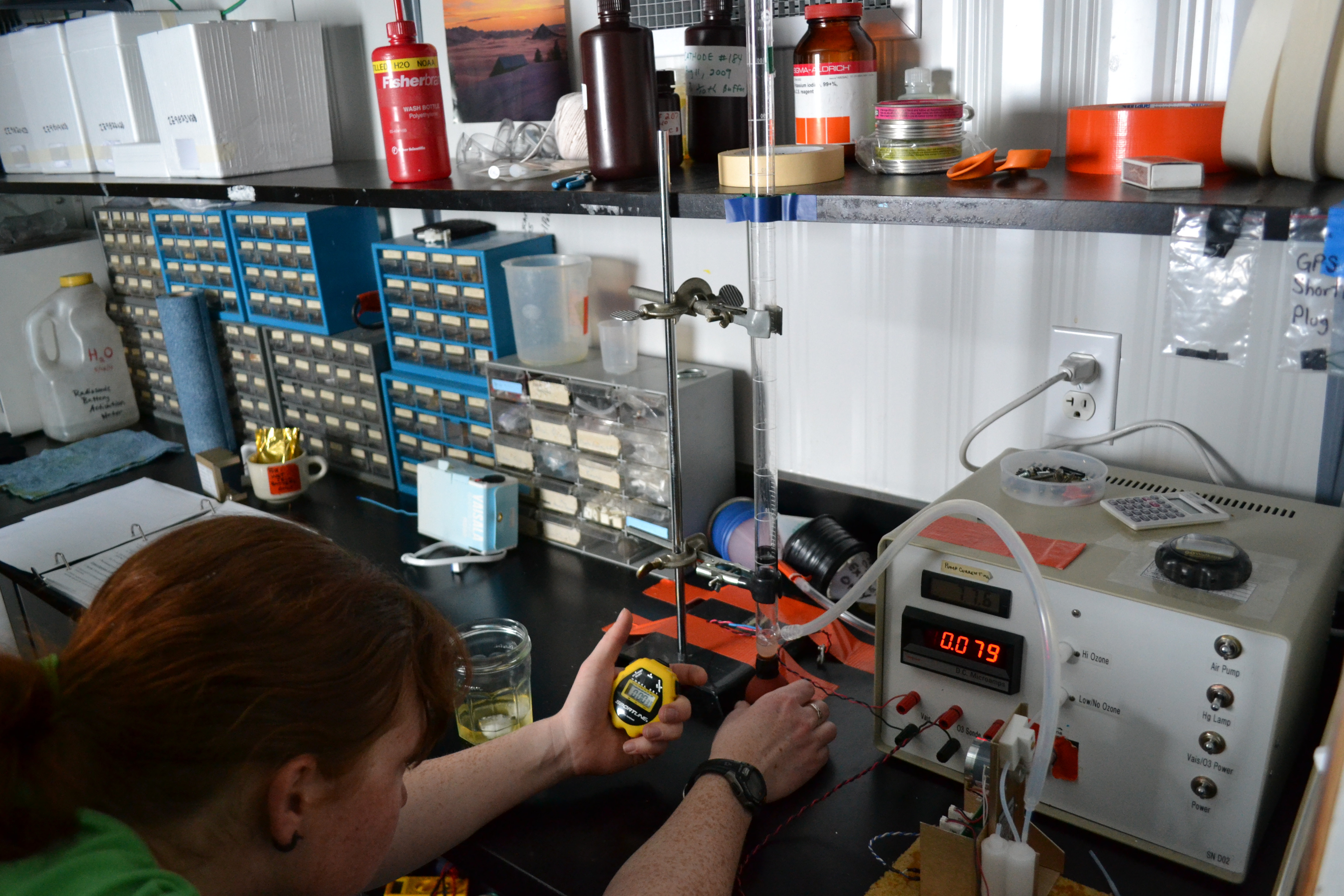 Science technician, Marie McLane, uses soap bubbles to make sure that the pump is flowing at the correct rate. Summit Station, Greenland.