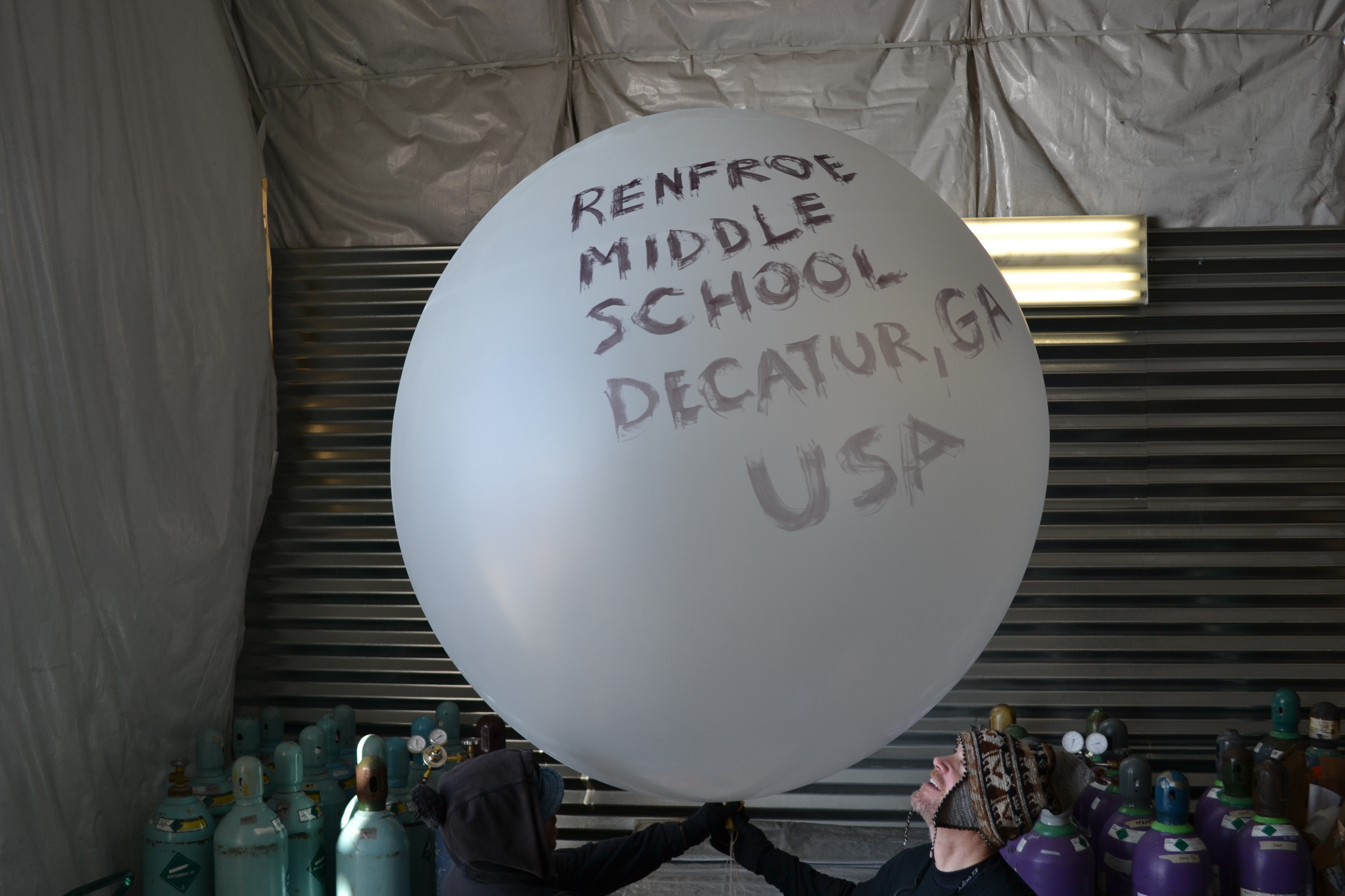 Kevin McMahon watches the inflation of a weather balloon with his school's name on it. Summit Station, Greenland.