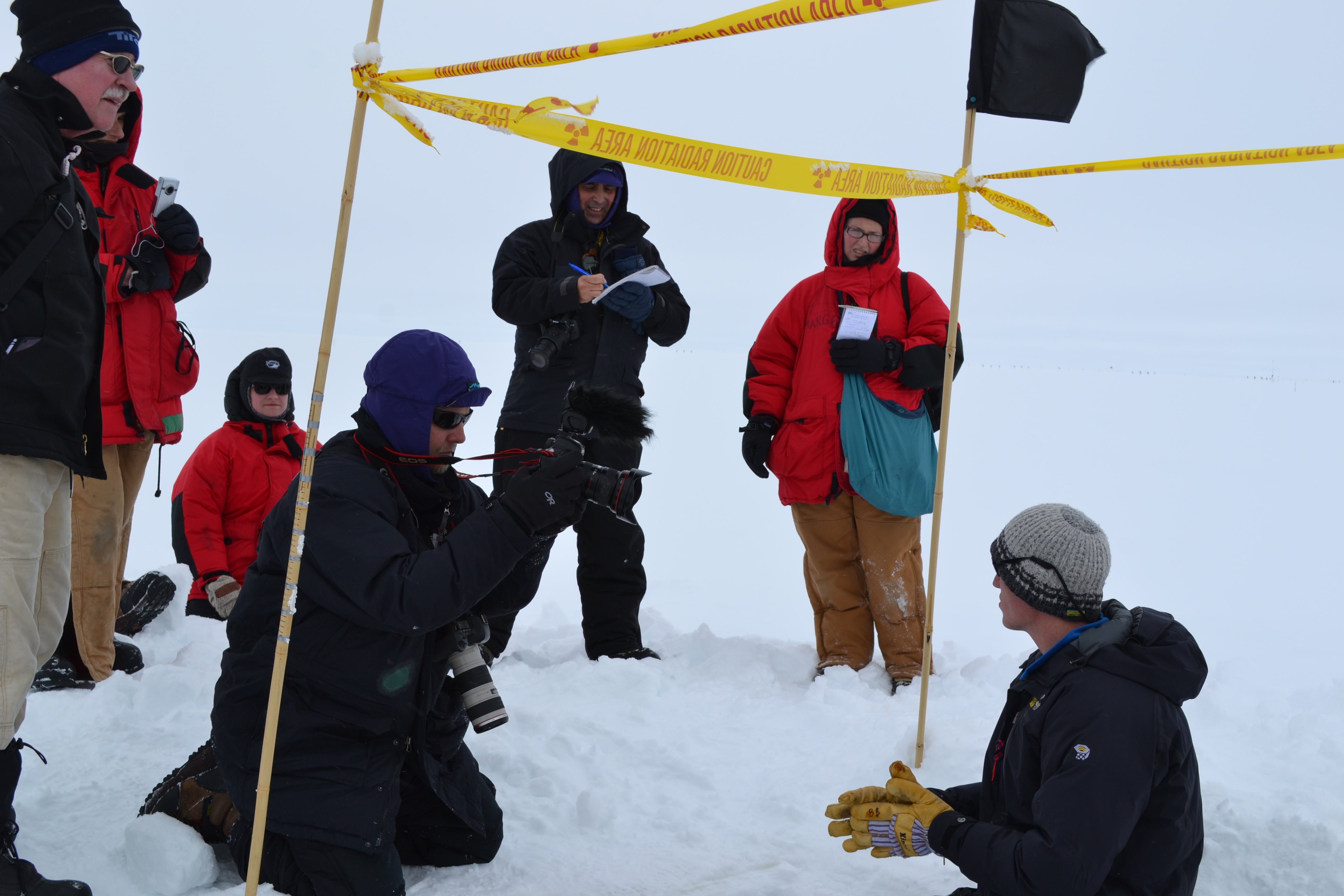 Brandon Strellis answers questions from the media at Summit Station, Greenland.