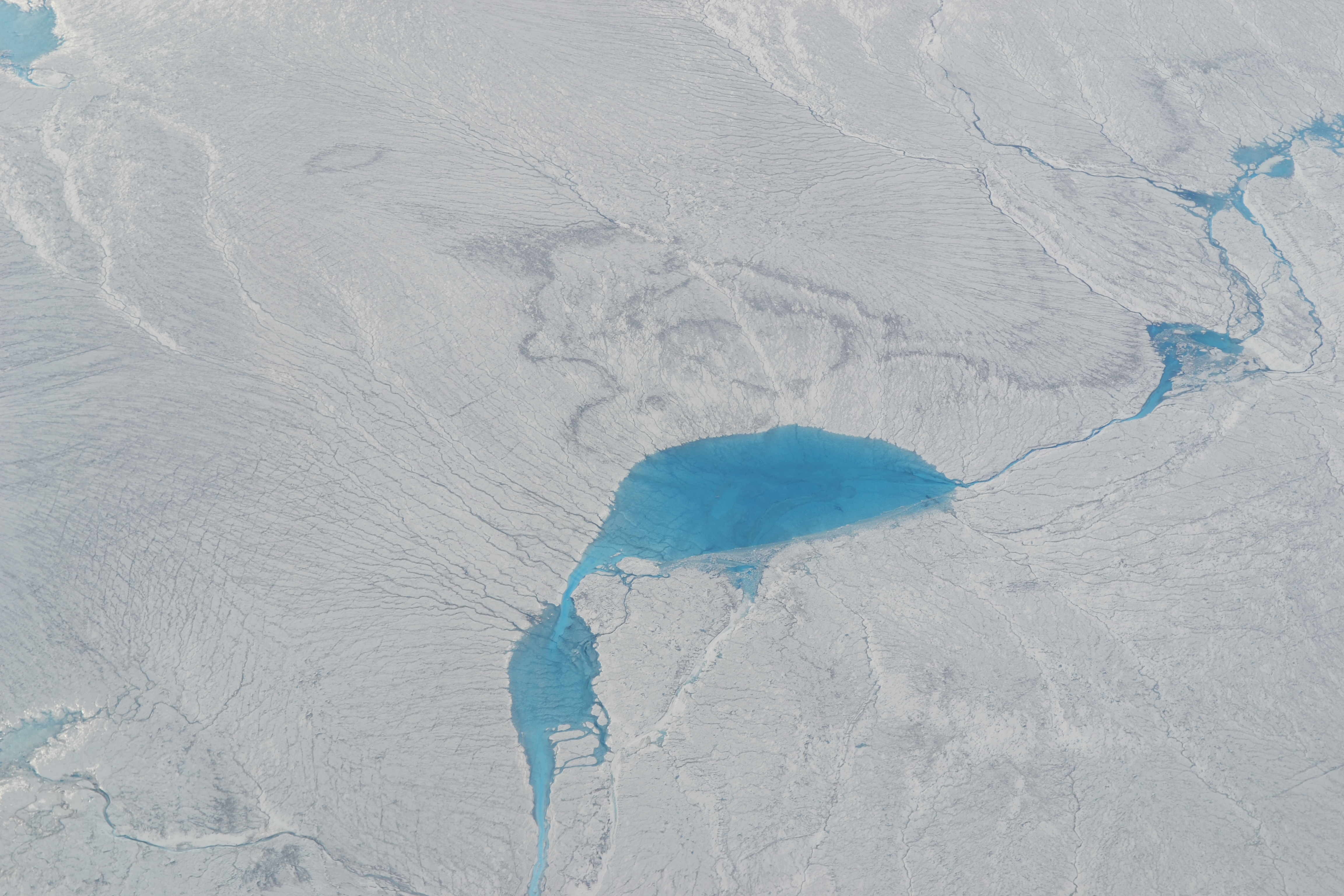 Melt water ponds near the edge of the Greenland Ice Sheet as seen from the LC-130 plane. Near Kangerlussuaq, Greenland.
