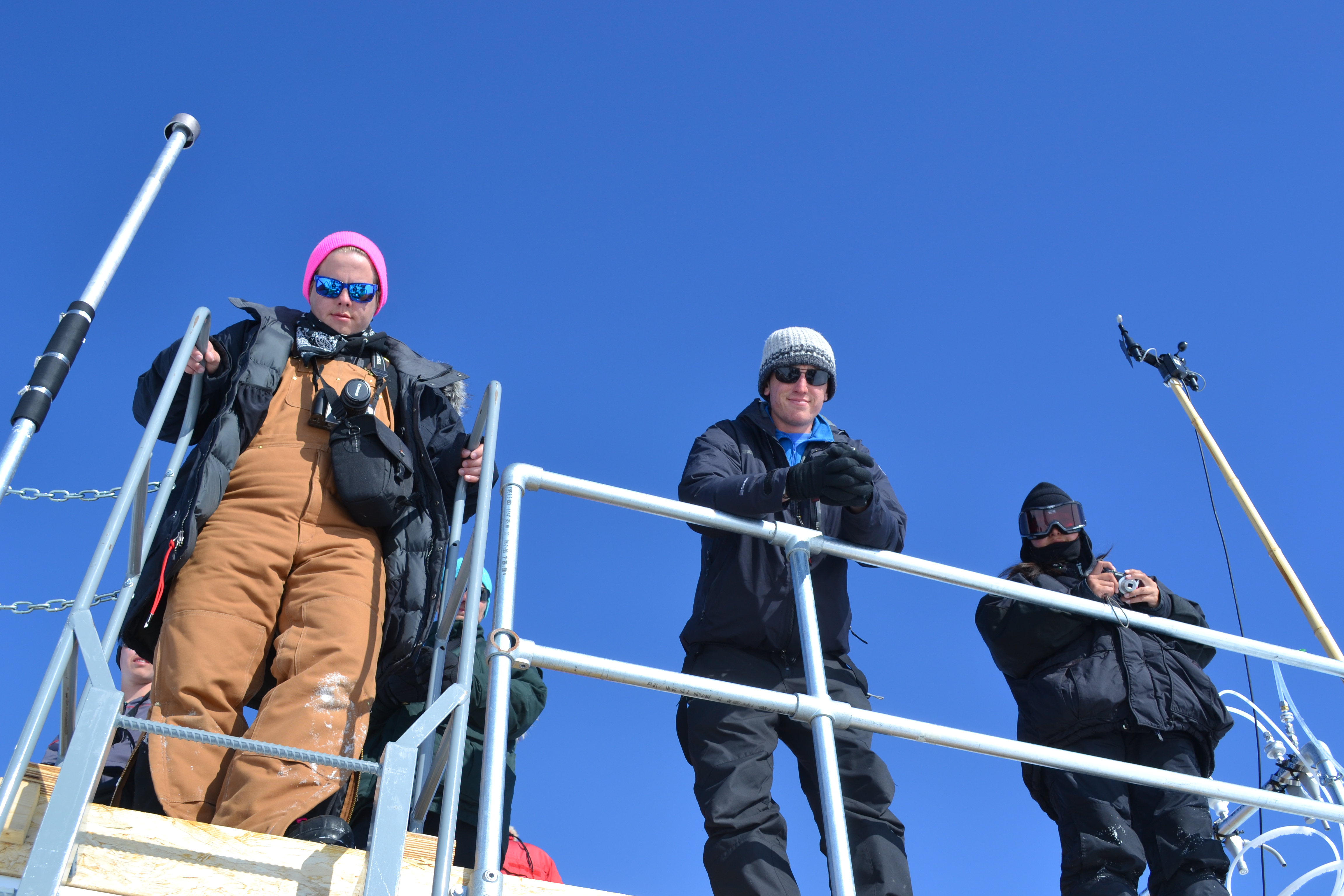 Brandon Strellis and JSEP (Joint Science Education Project) students on top of the Temporary Atmospheric Watch Observatory at Summit Station, Greenland.