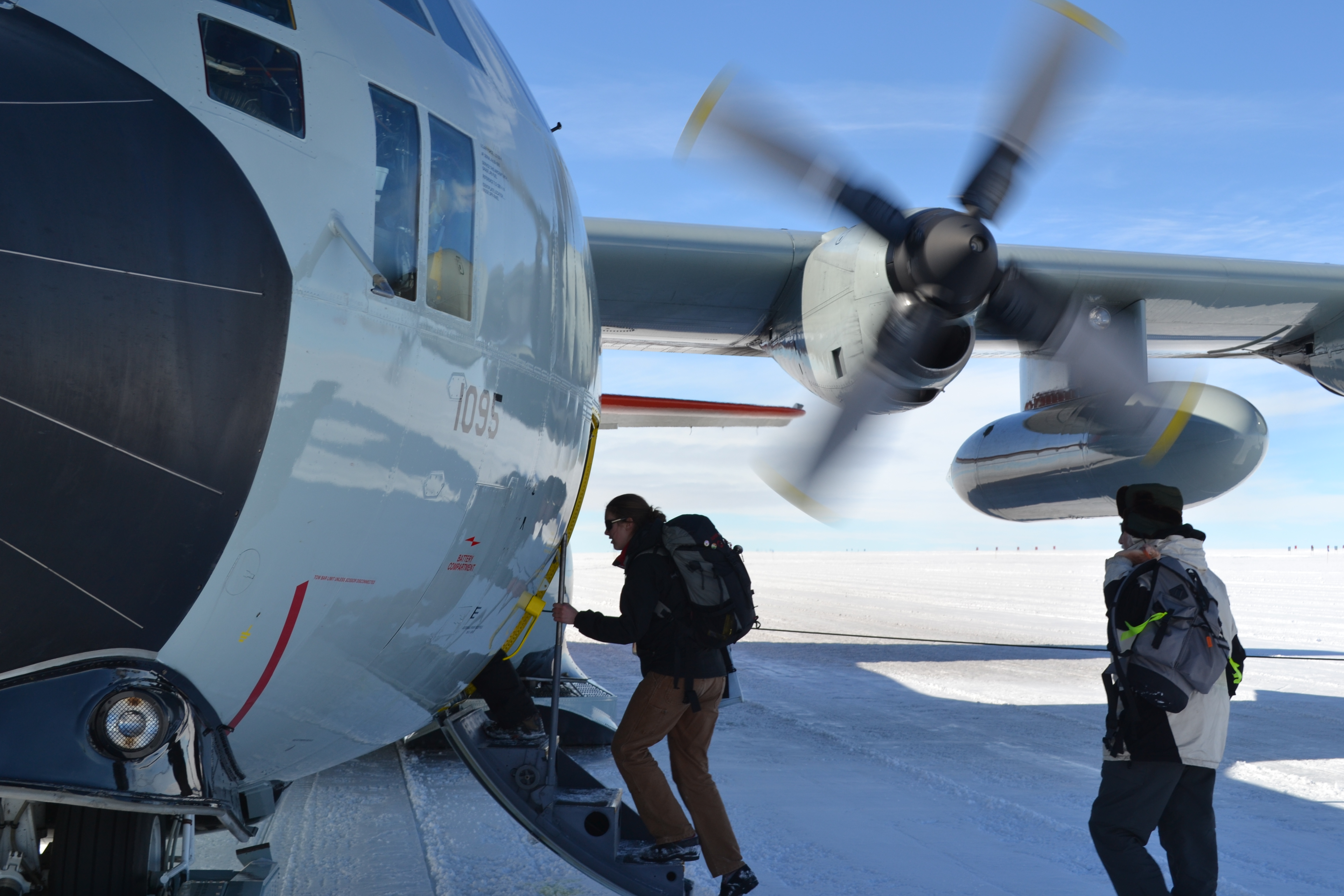 Hannah James climbs aboard the LC-130. Summit Station, Greenland.