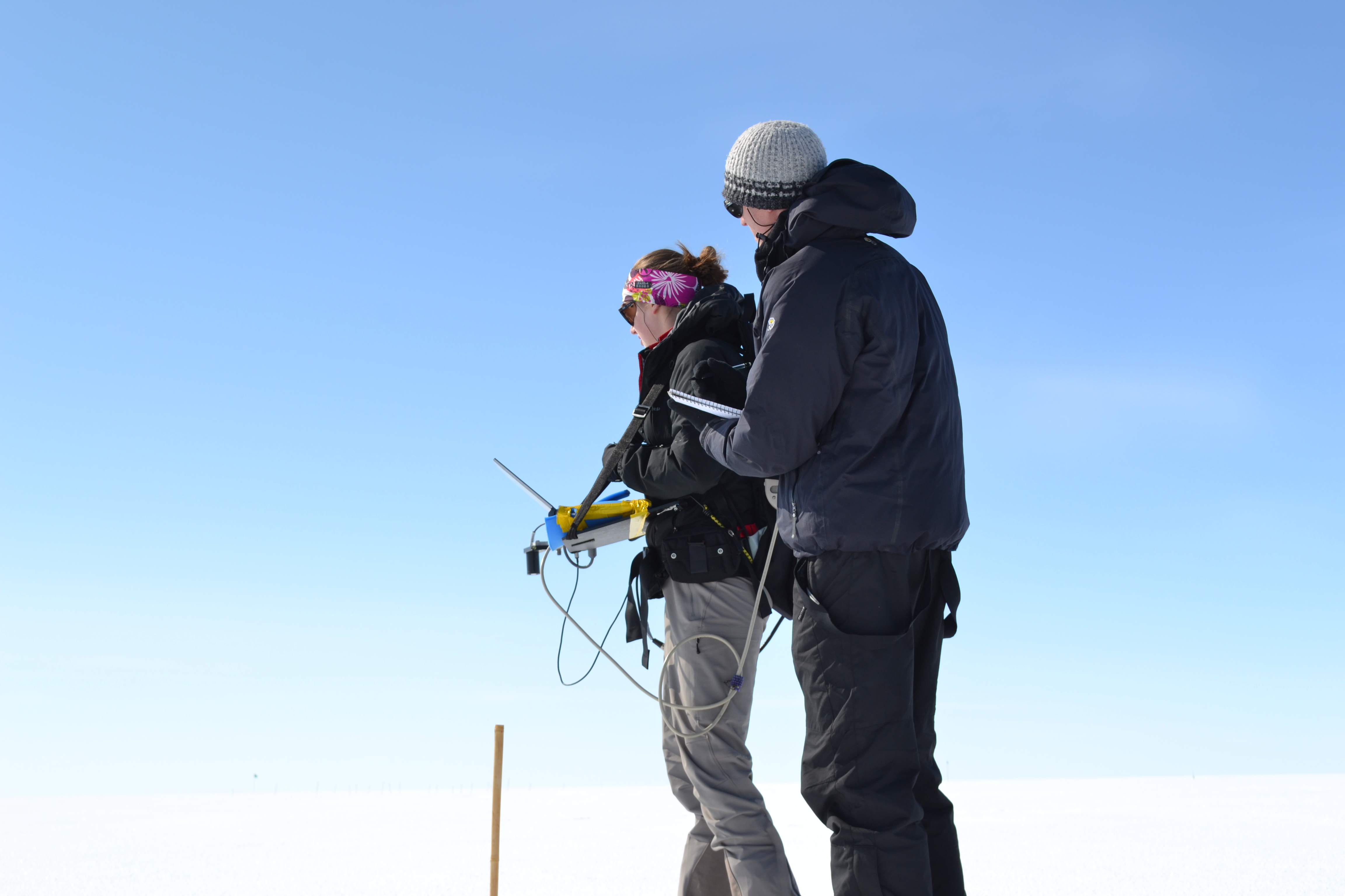 Hannah James takes albedo measurements on the Greenland Ice Sheet with the assistance of Brandon Strellis. Summit Station, Greenland.