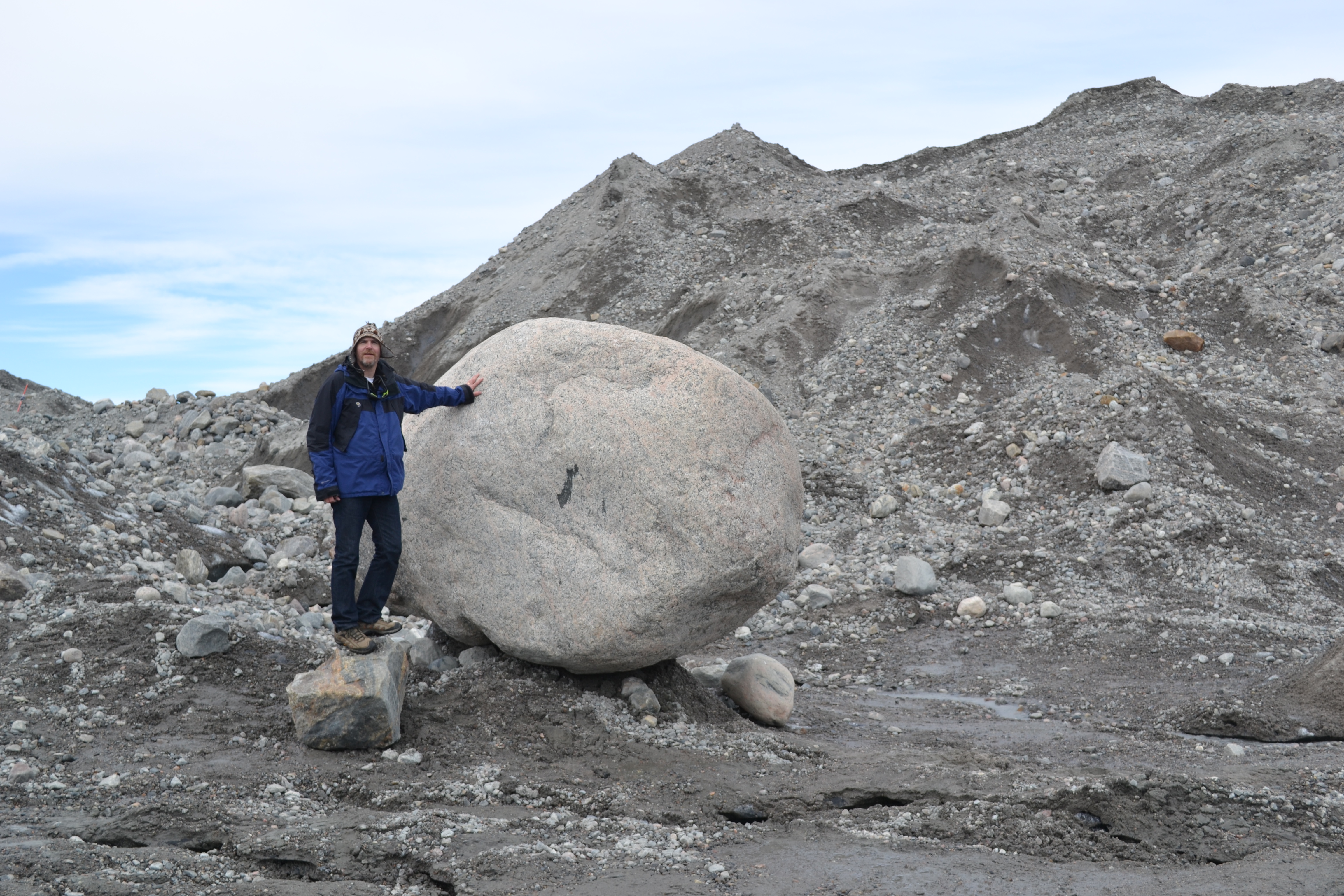 Kevin McMahon stands next to a boulder that was dropped by the melting glacier. Kangerlussuaq, Greenland.