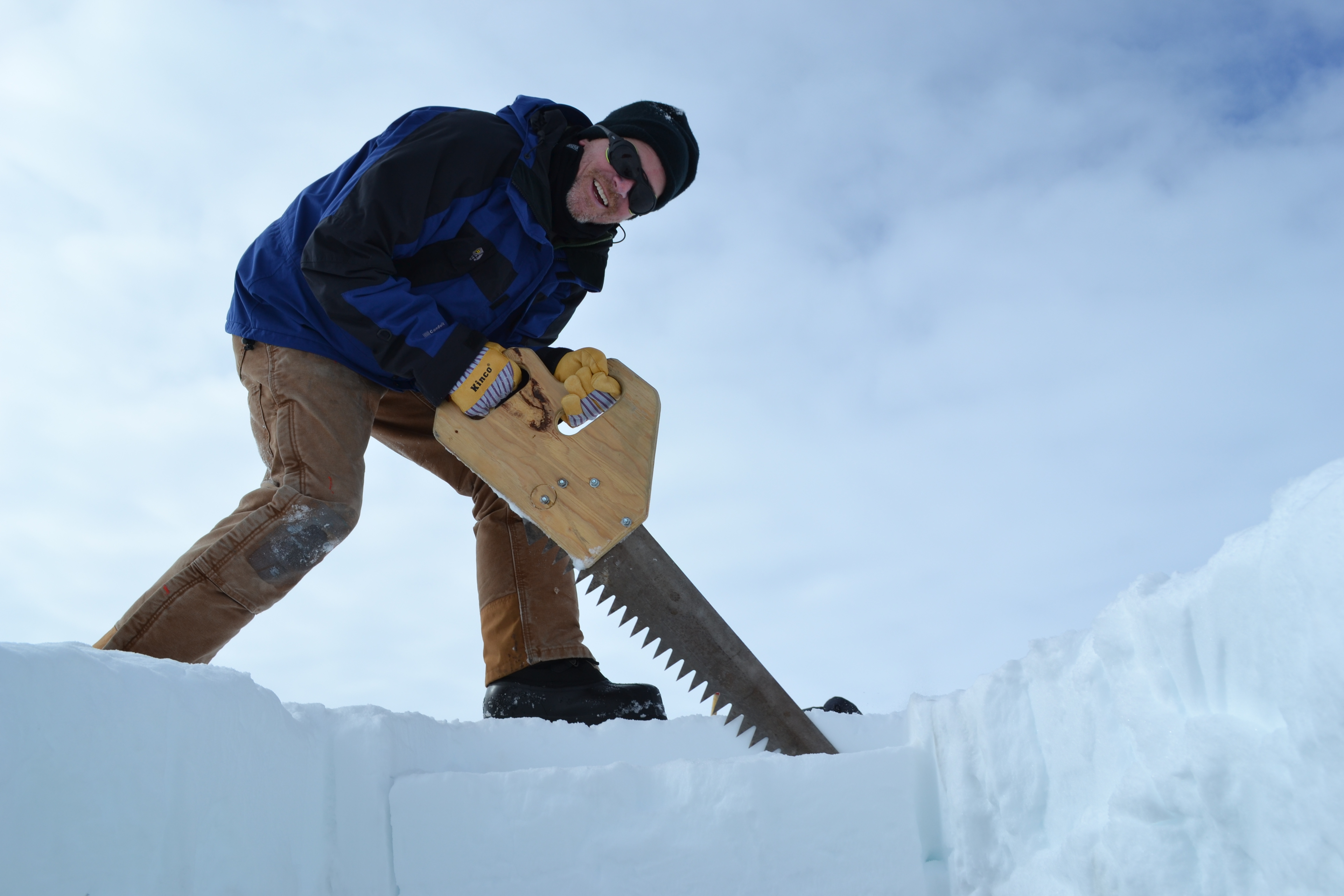 Kevin McMahon uses a large snow saw to help build an underground snow lab. Summit Station, Greenland.