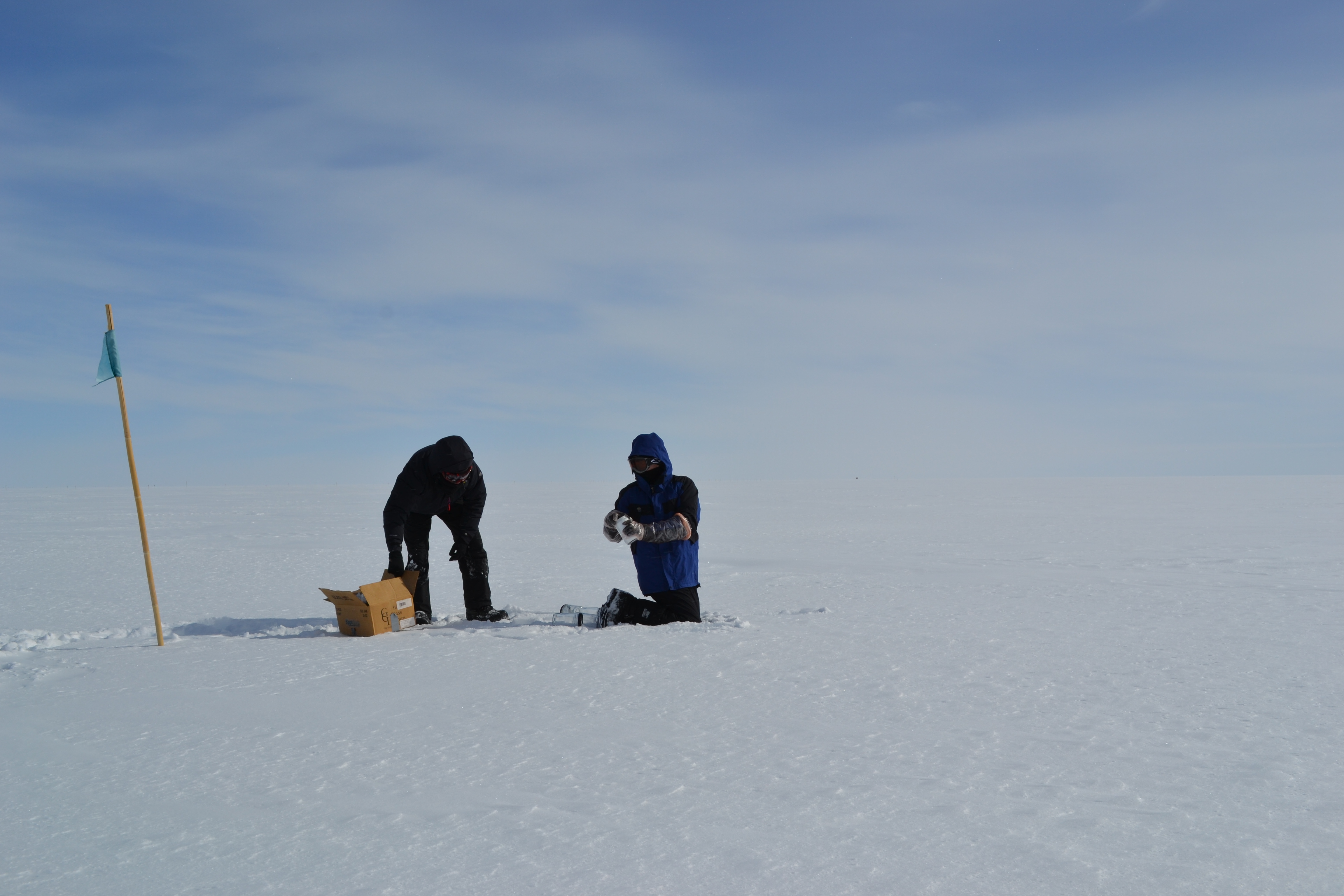 Kevin McMahon collects surface snow samples from the Greenland Ice Sheet with the assistance of Brandon Strellis. Summit Station, Greenland.