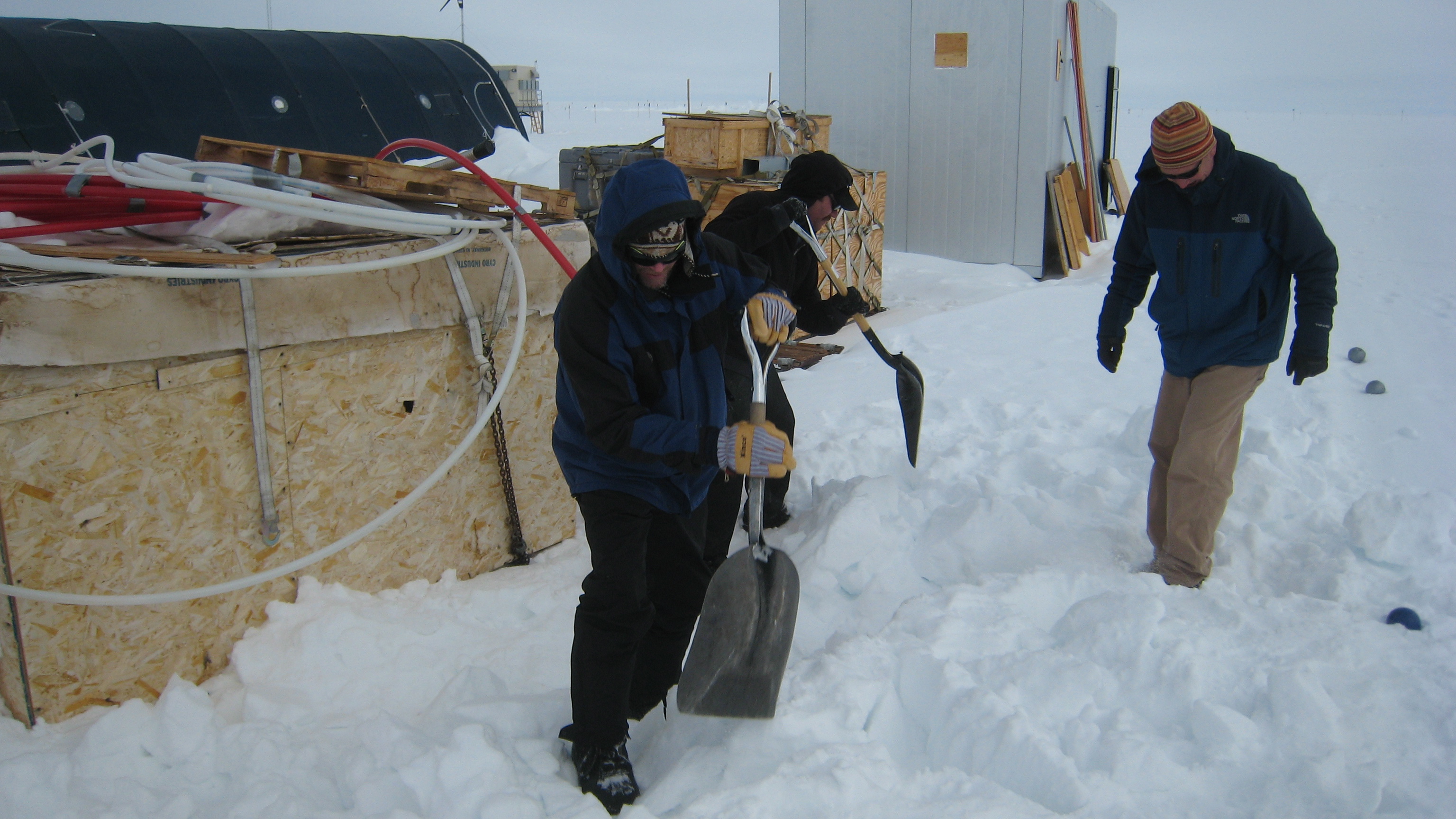 Kevin McMahon lends a hand to search for a lost bocce ball in the snow. Summit Station, Greenland.