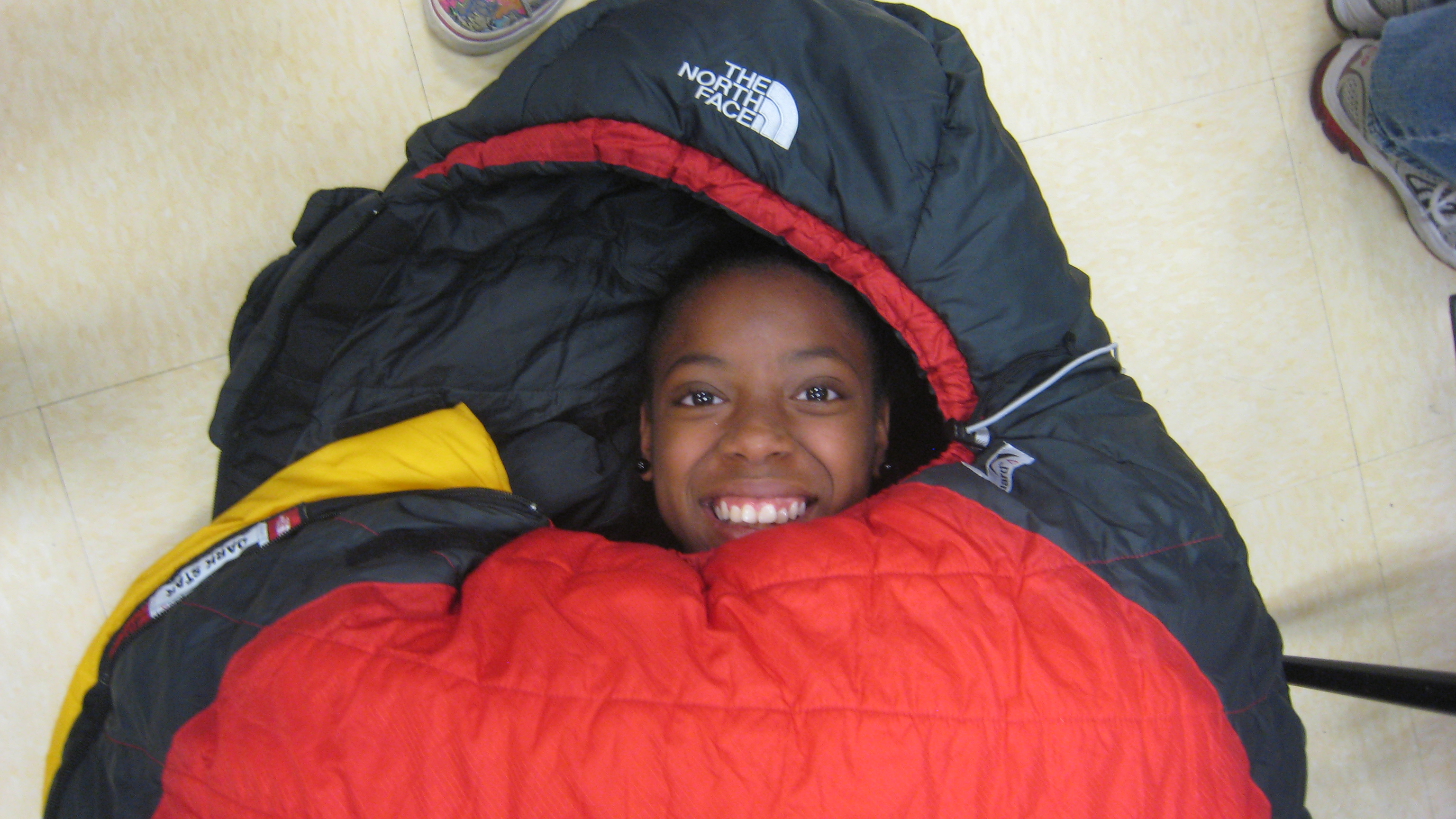 A student in Mr. McMahon's class tries out a cold weather sleeping bag designed to keep a person warm in Arctic conditions. Renfroe Middle School in Decatur, Georgia.
