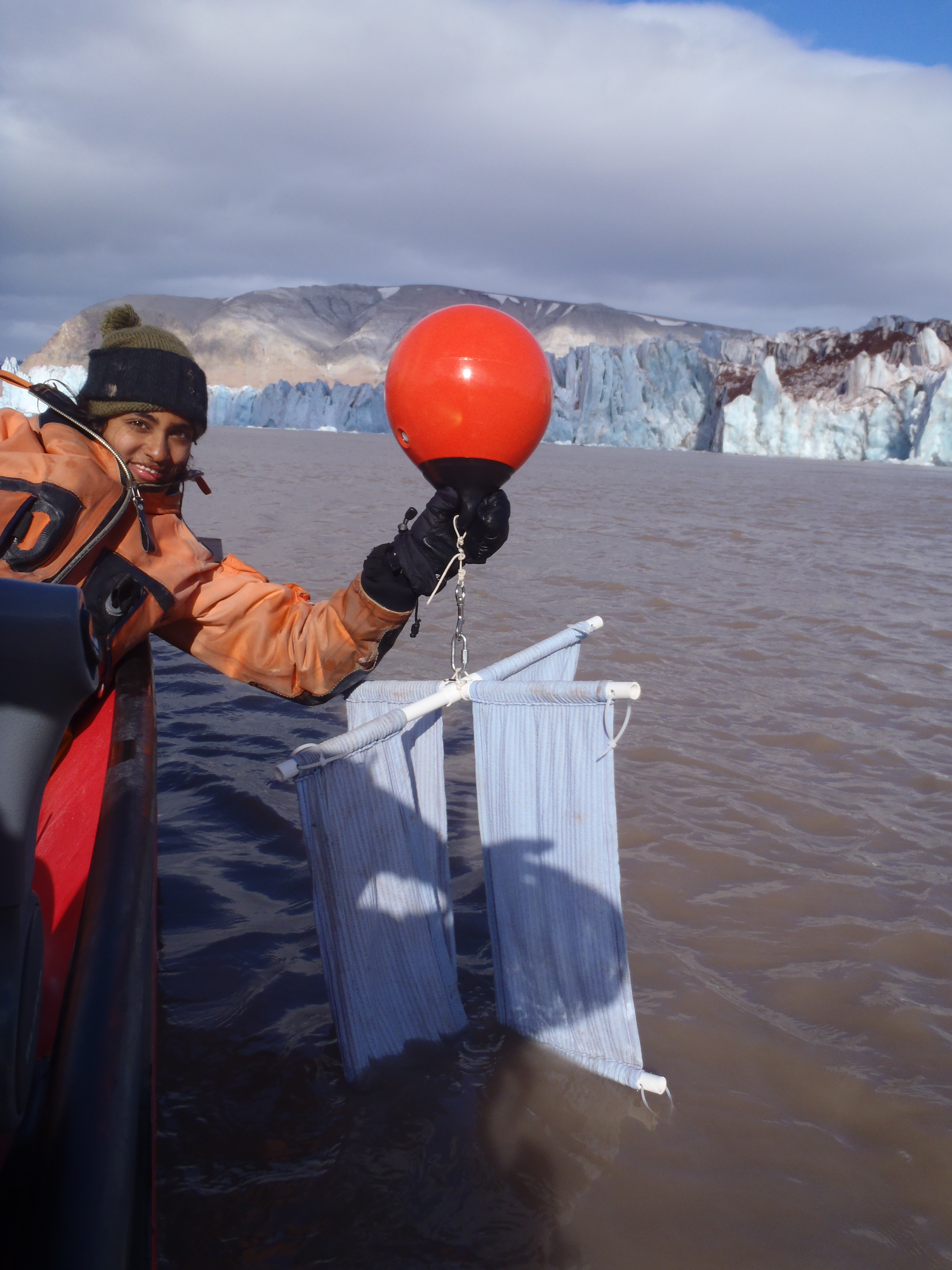 Daksha Rajagopalan puts a drogue into the water. Ny Ă…lesund, Svalbard, Norway.