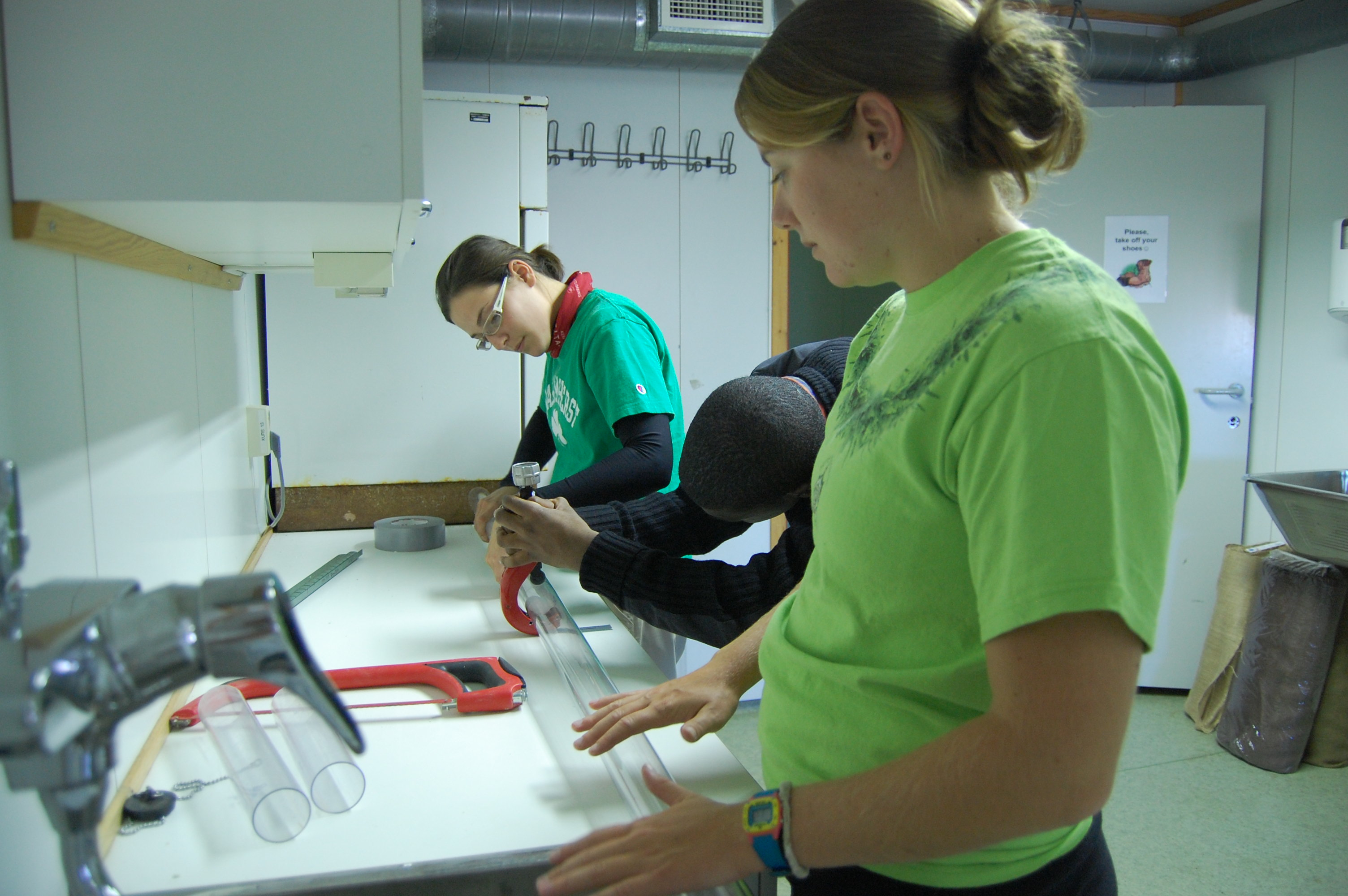 Rachel Valletta, Daren McGregor, and Liz Ceperley cut plastic tubing for the core sampling device. Ny Ă…lesund, Svalbard, Norway.