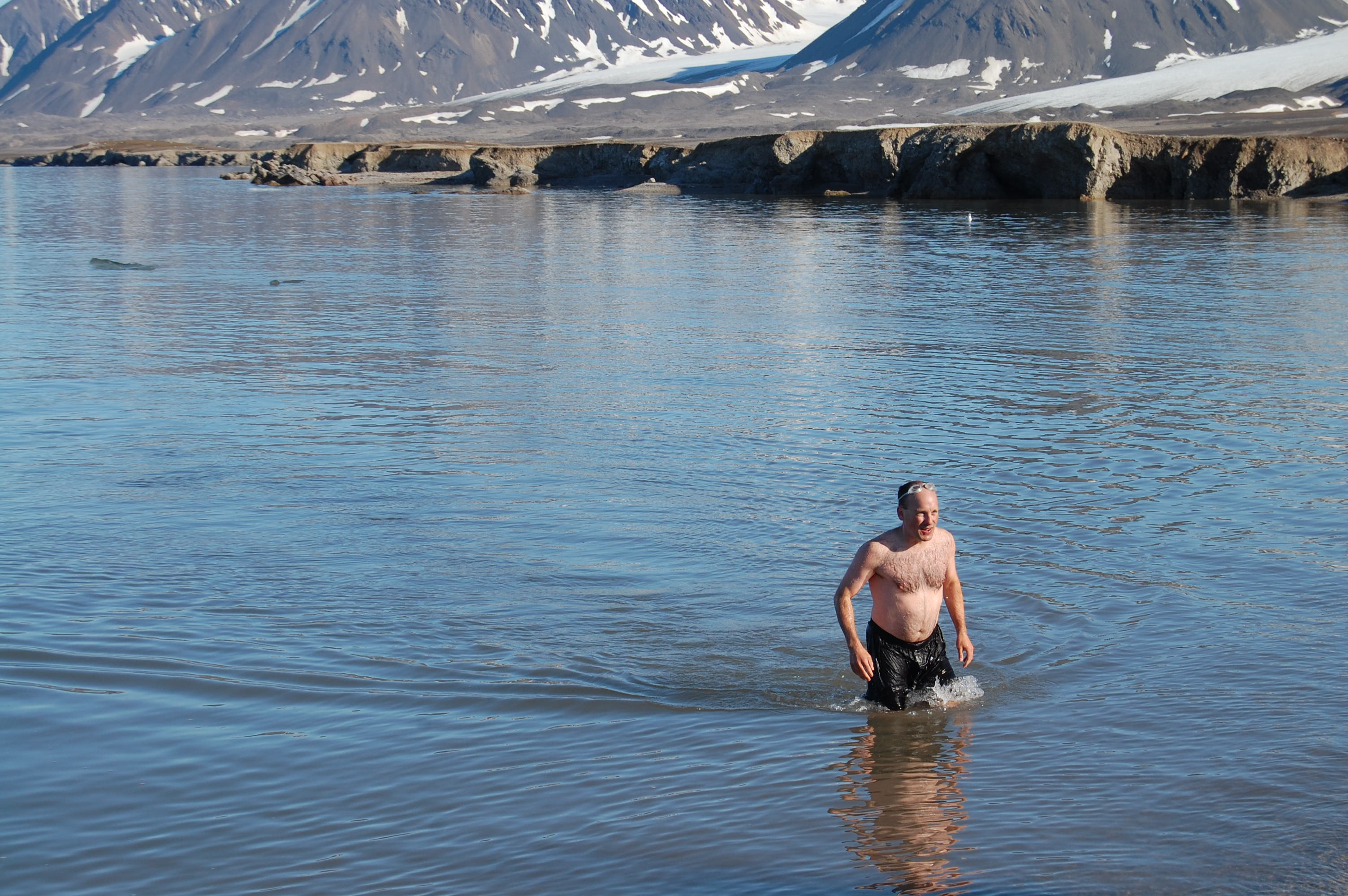 Mark Goldner comes out after a refreshing swim. Ny Ă…lesund, Svalbard, Norway.
