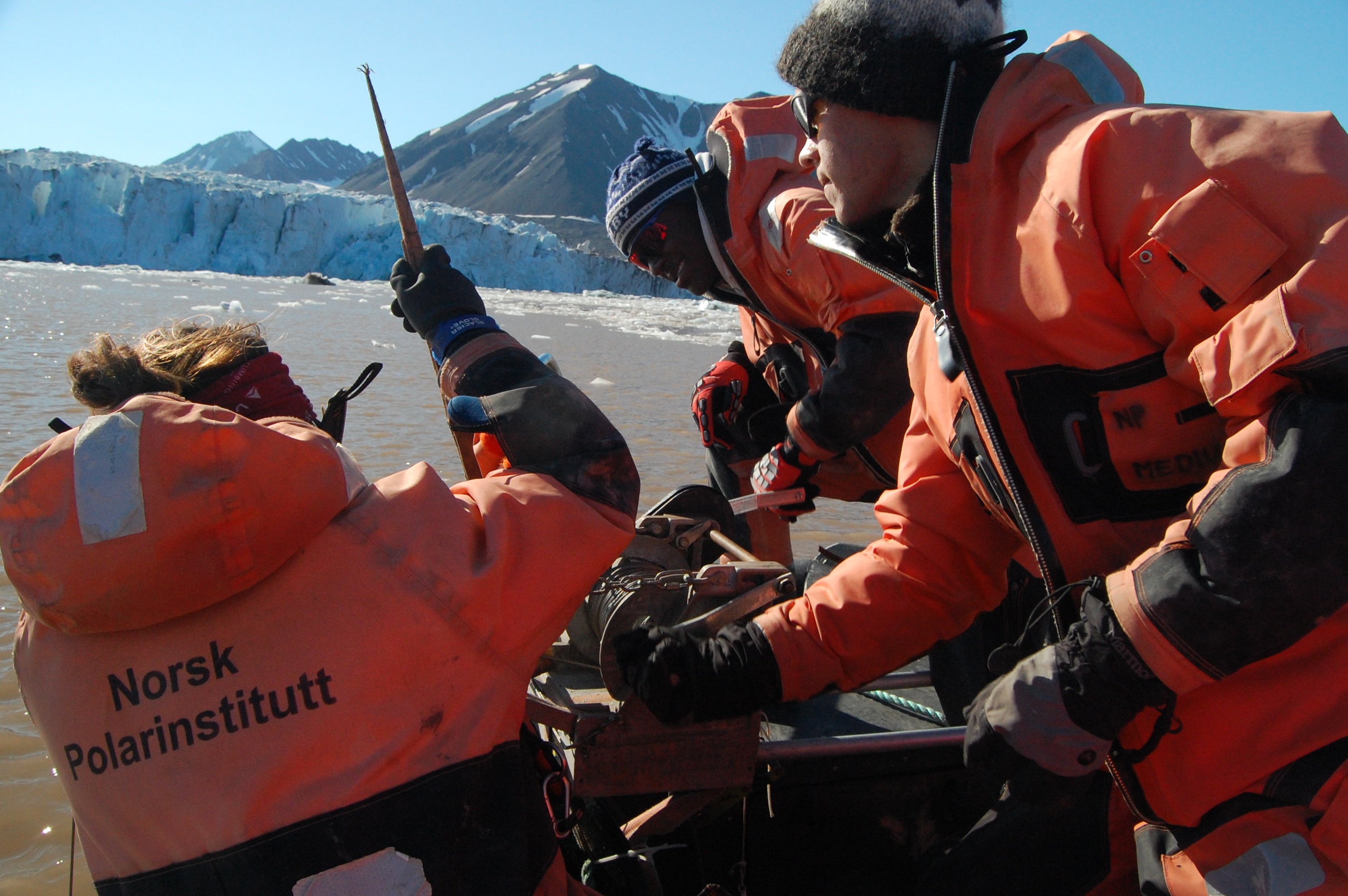 Raising the gravity corer is hard work, so George Roth helps Daren McGregor with the winch when it's time to raise the core. The corer is over 40 pounds including the weight of the cable, and there's friction between the cable and the winch making it a challenge to bring up. Ny Ă…lesund, Svalbard, Norway.