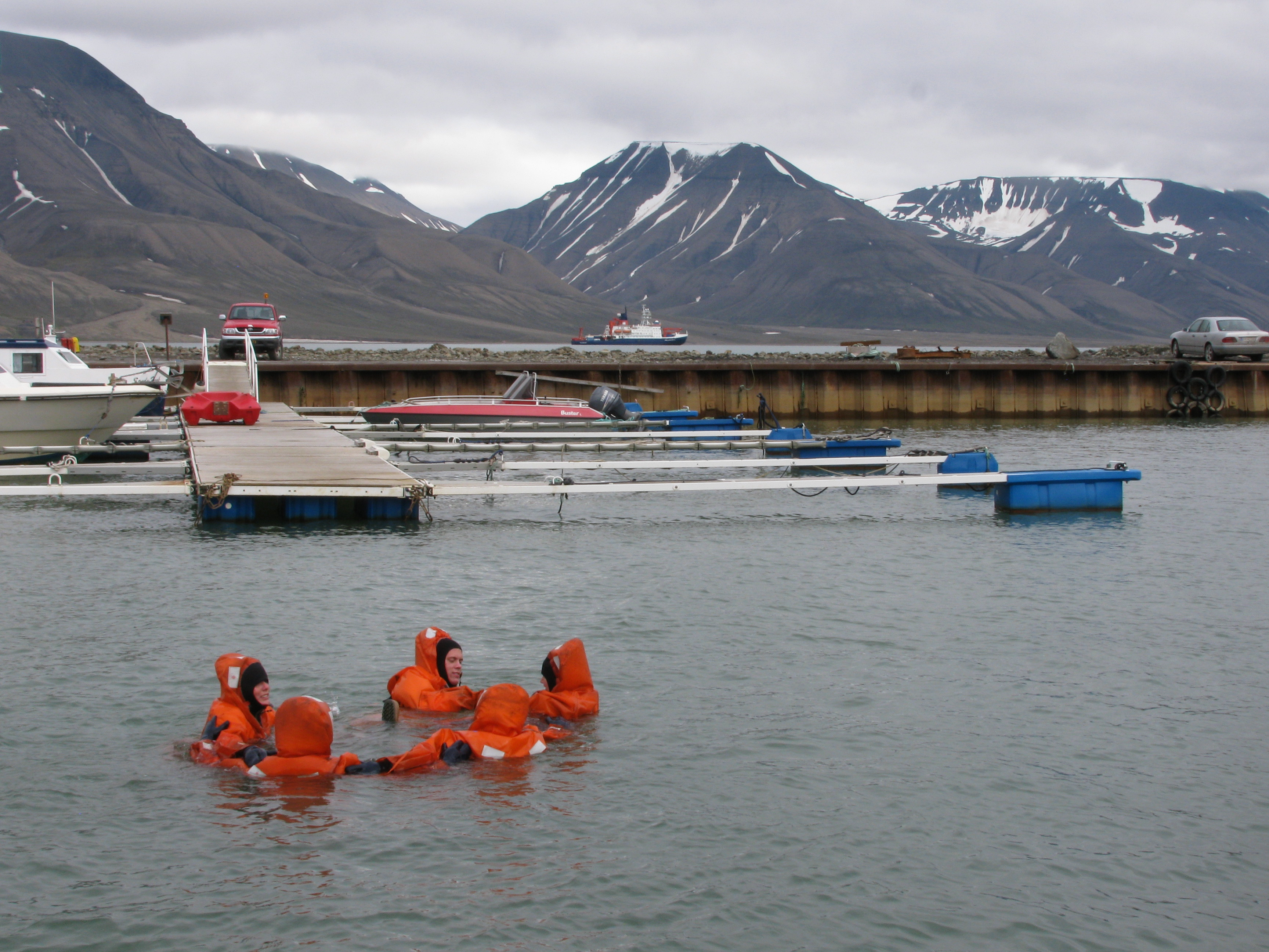 The team practices maneuvering in the water in their survival suits. Longyearbyen, Svalbard, Norway.