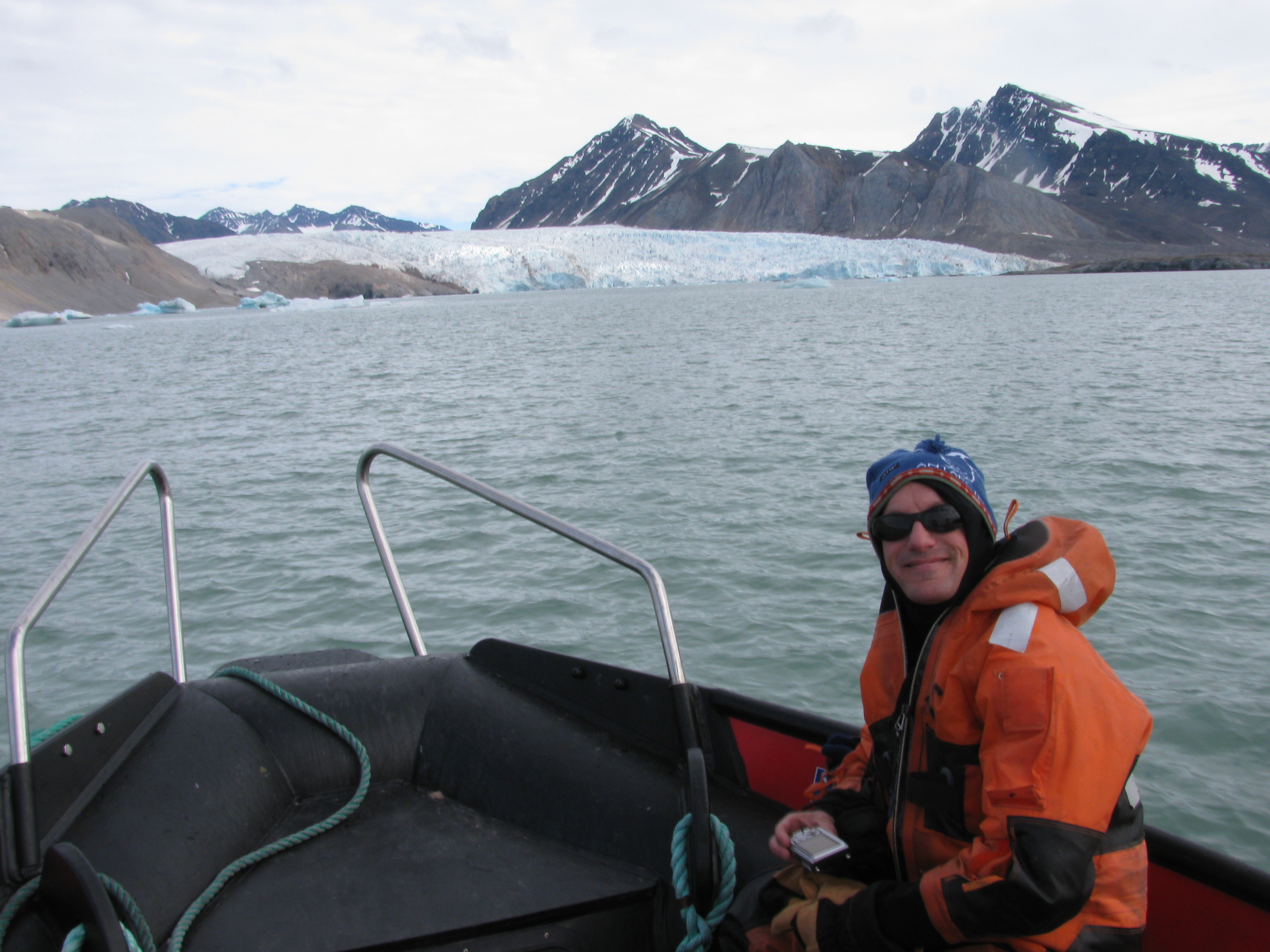 Mark Goldner enjoys the boat ride out to the research site. Ny Ă…lesund, Svalbard, Norway.
