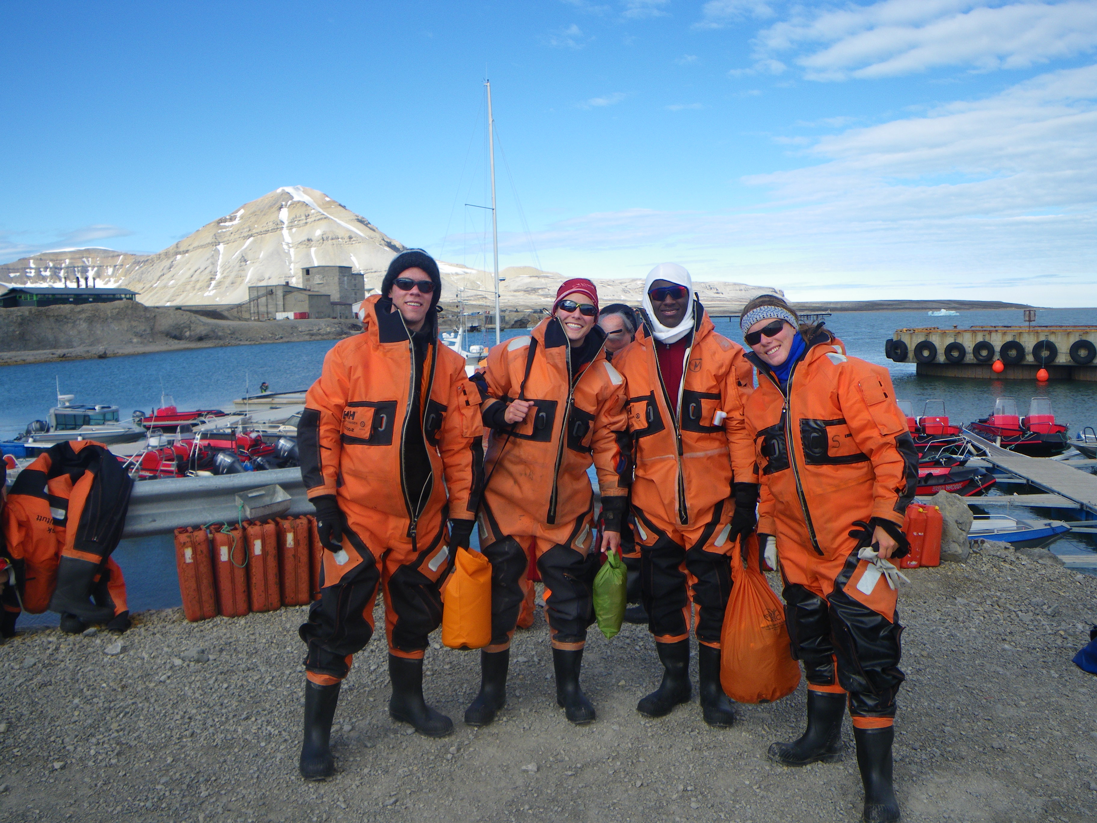 The REU students suit up for their first boat excursion. Ny Ă…lesund, Svalbard, Norway.