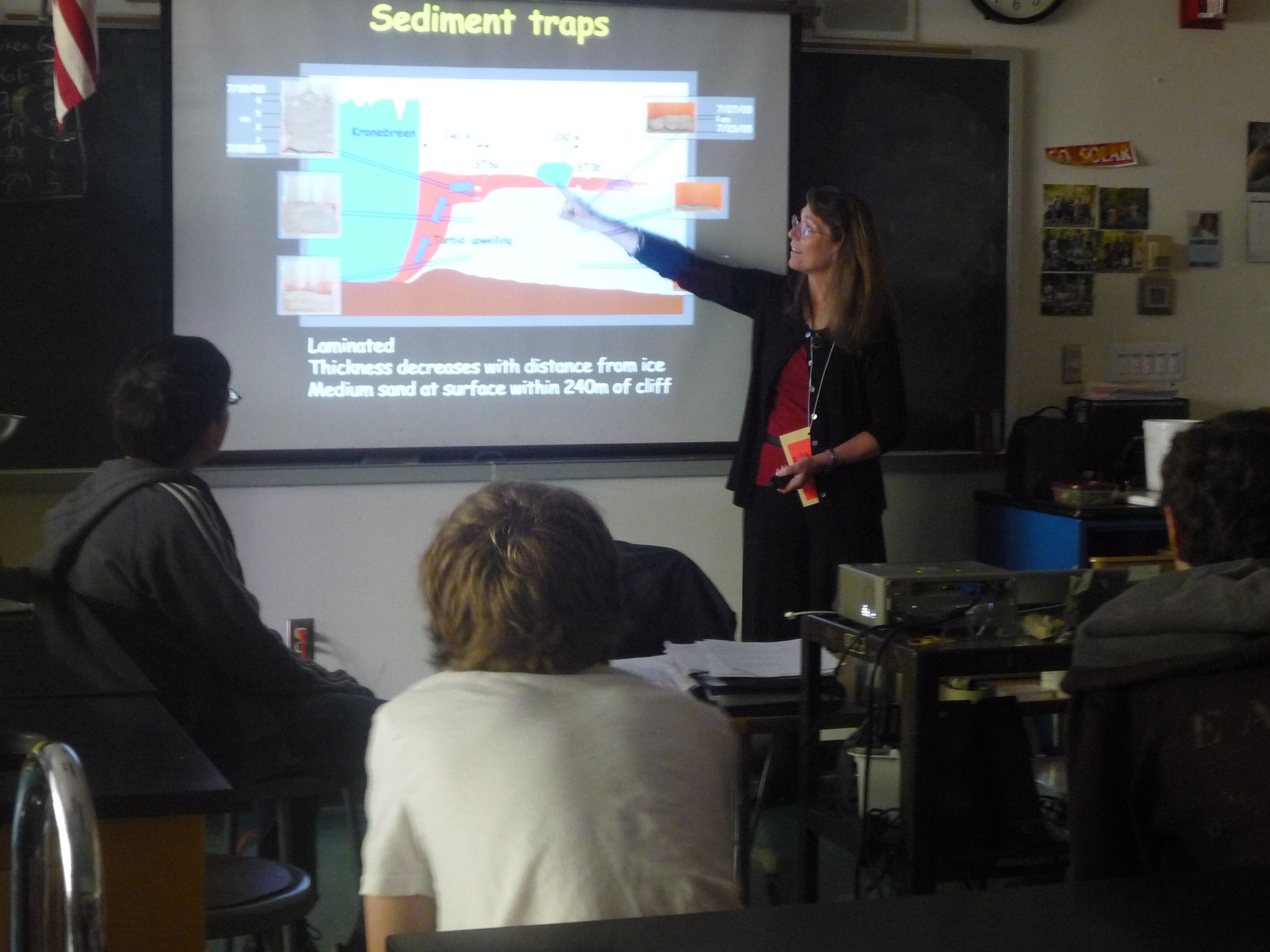 Julie Brigham-Grette talks to Mark Goldner's class about some of her research methods. Brookline, Massachusetts.