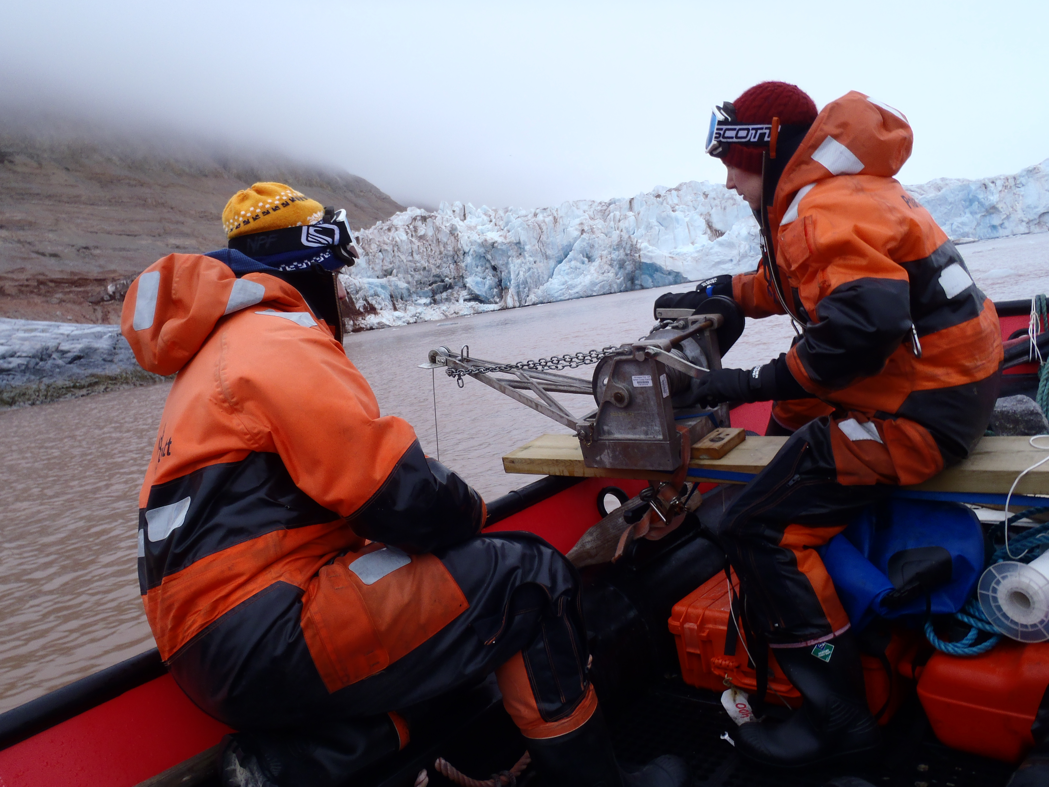 Rebecca Siegel works the winch while Liz Ceperley sends down the "messenger" – a small piece that closes the box and captures a load of mud. Ny Ålesund, Svalbard, Norway.