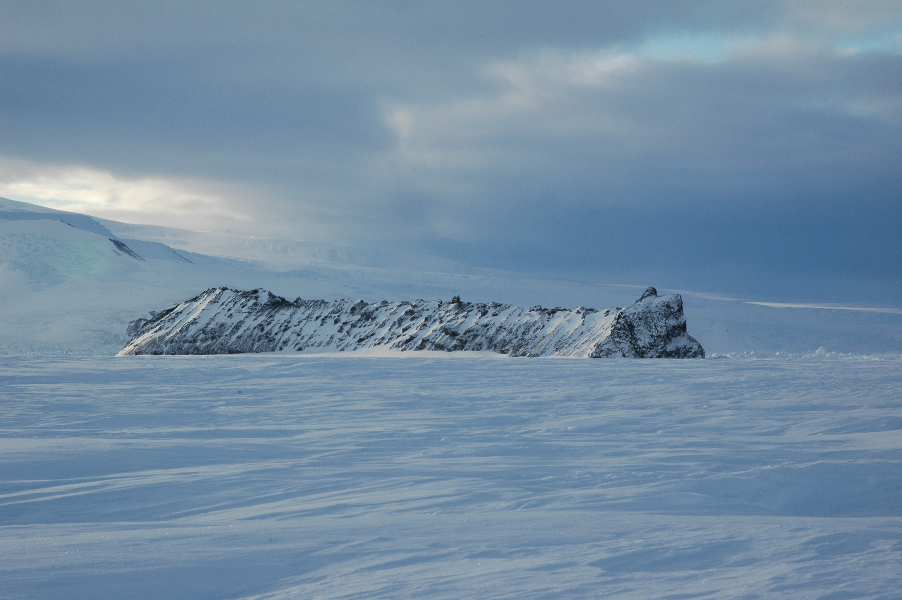 An island pokes out above the sea ice. McMurdo Station, Antarctica.