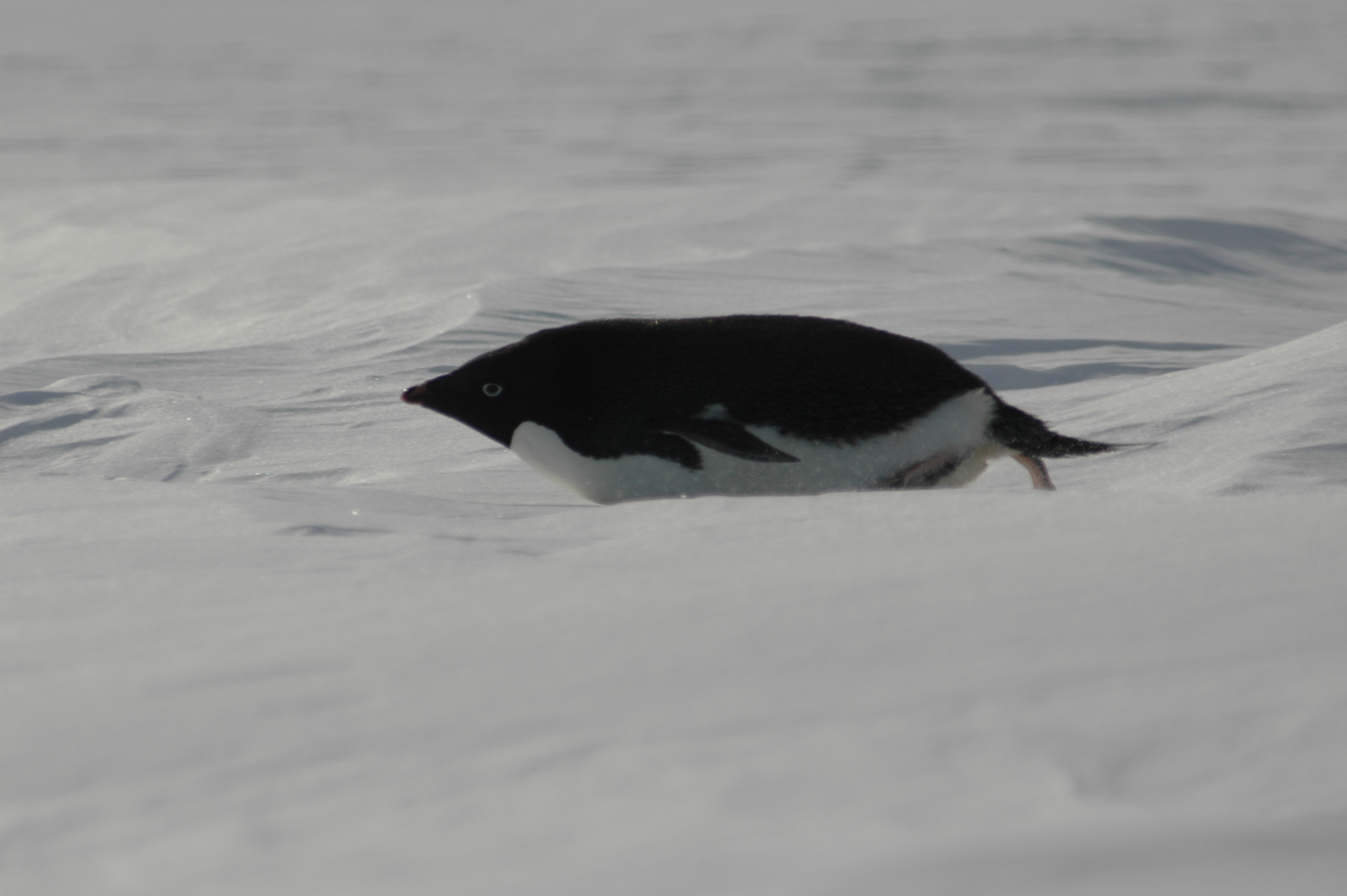 An Adélie penguin slides along the ice on its belly. McMurdo Station, Antarctica.