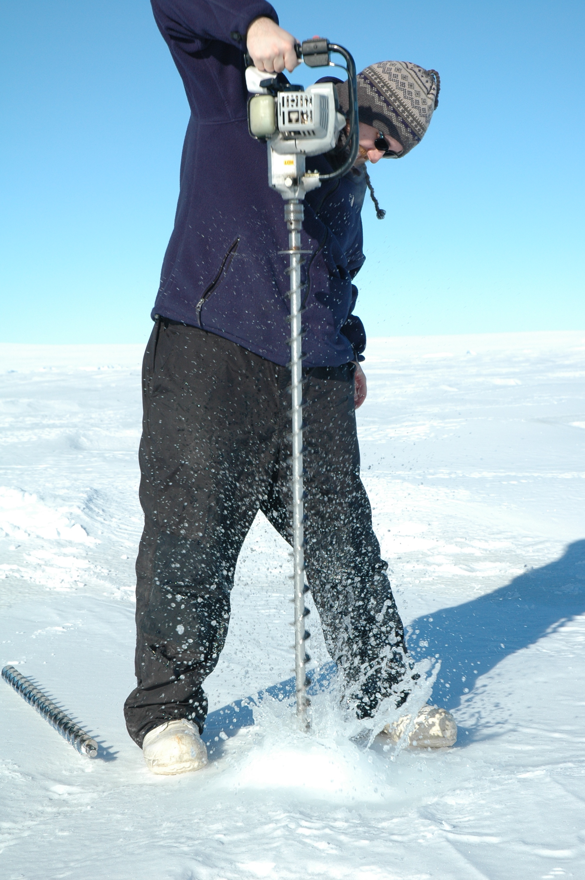A power drill is used to make a hole in the sea ice. McMurdo Station, Antarctica.