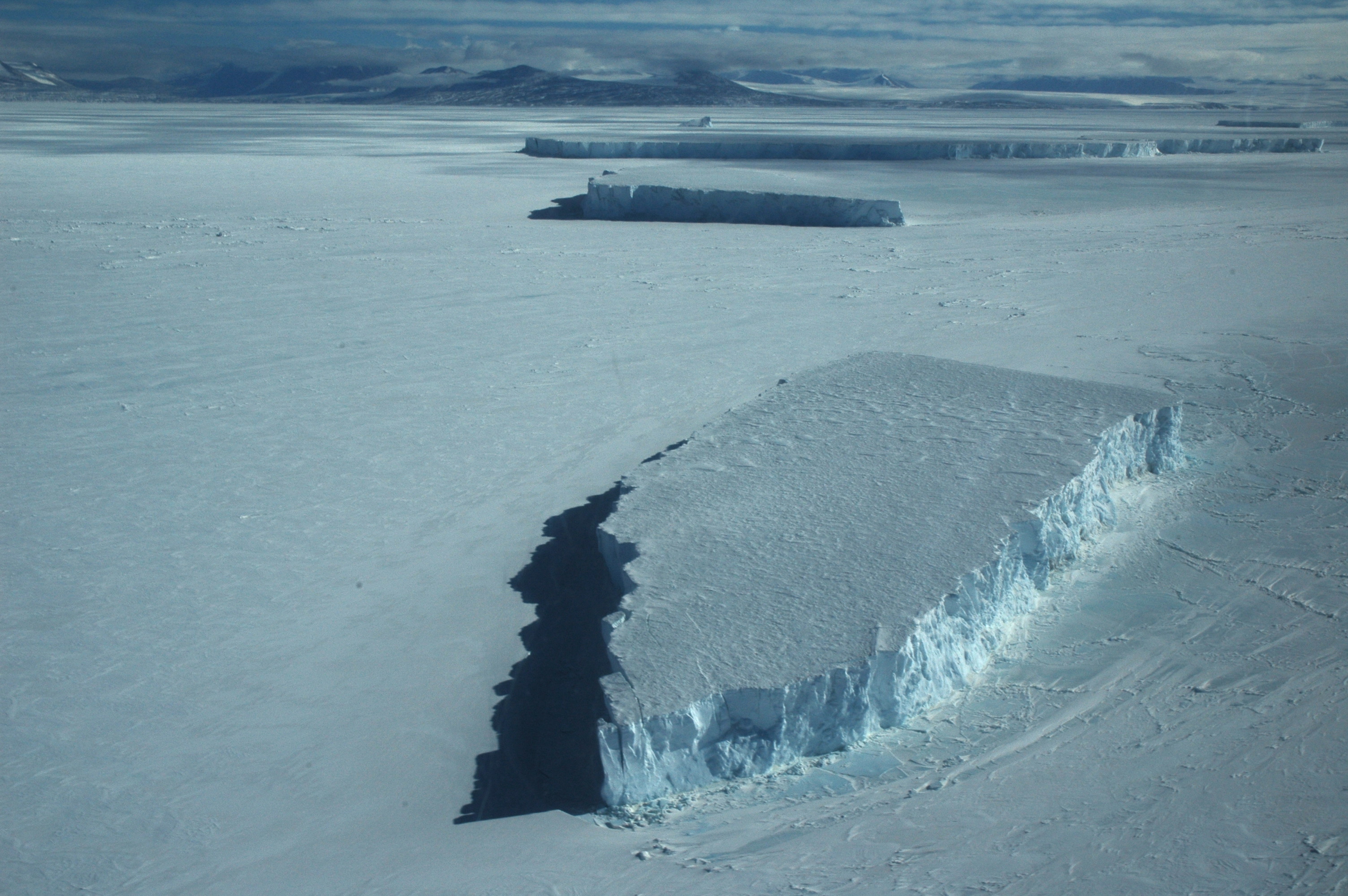 Icebergs break off of ice shelves and glaciers and float into the sea ice. These icebergs are frozen in place, surrounded by the frozen ocean. McMurdo Station, Antarctica.