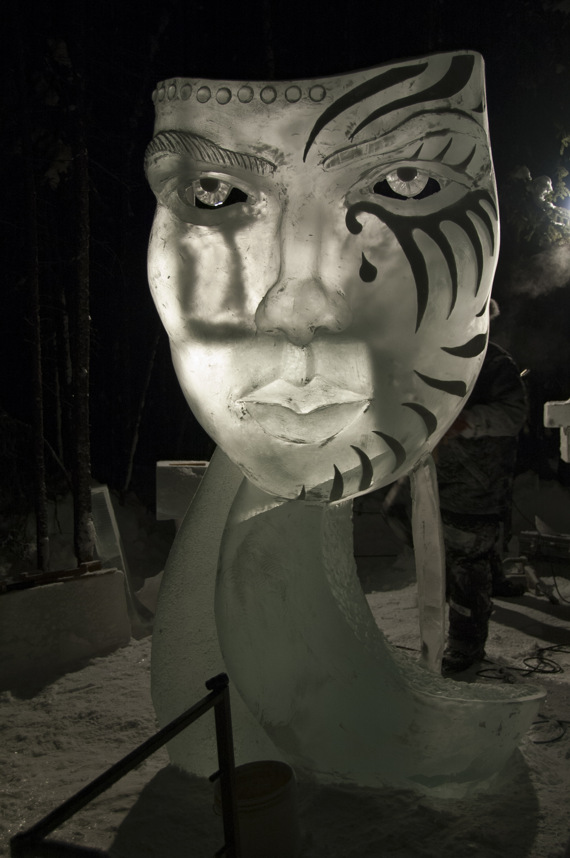 A giant mask carved out of ice at the World Ice Art Championships in Fairbanks, Alaska.