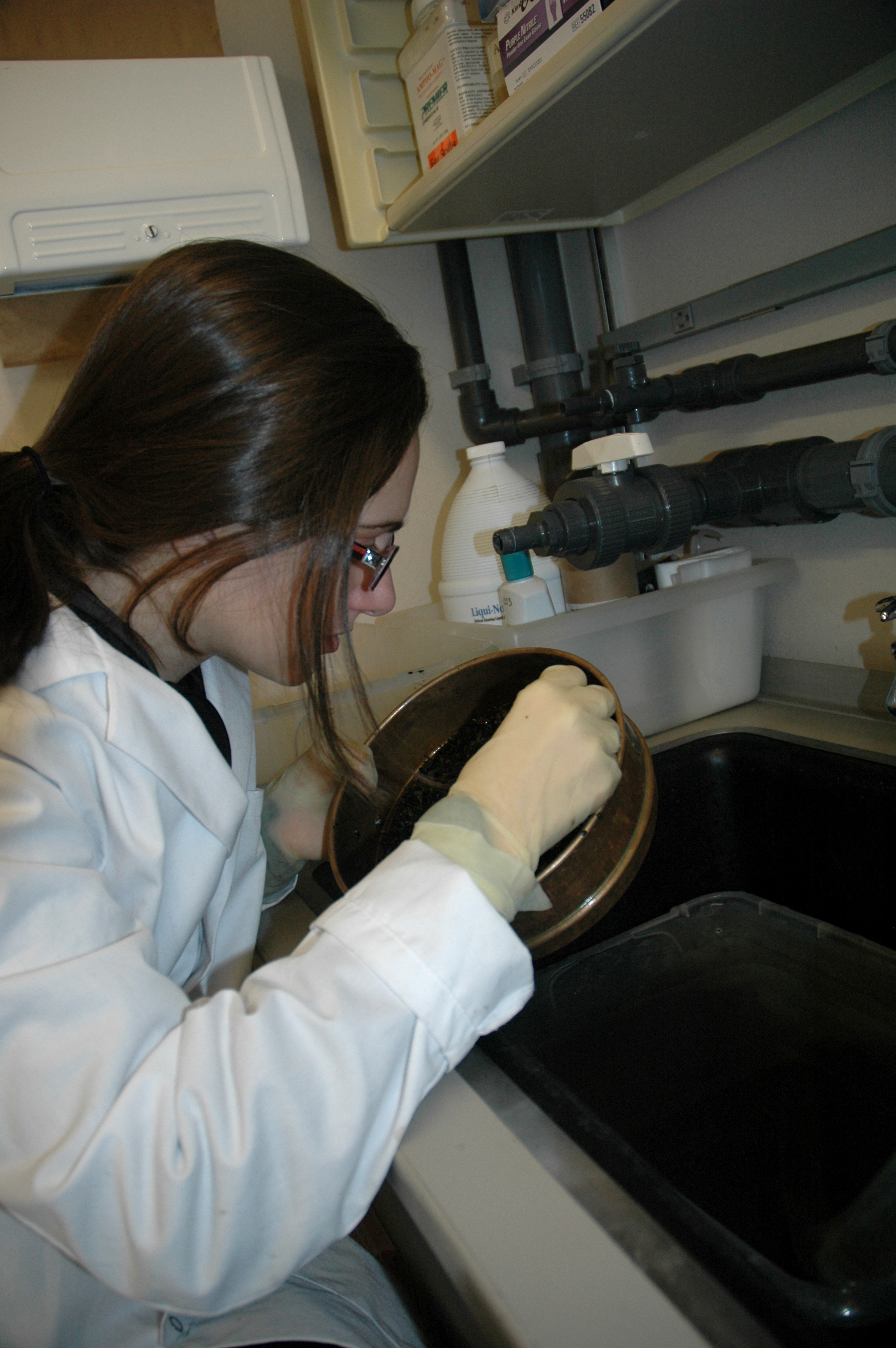 Annamarie Pasqualone sieves the sediment, carefully looking for Capitella worms. McMurdo Station, Antarctica.