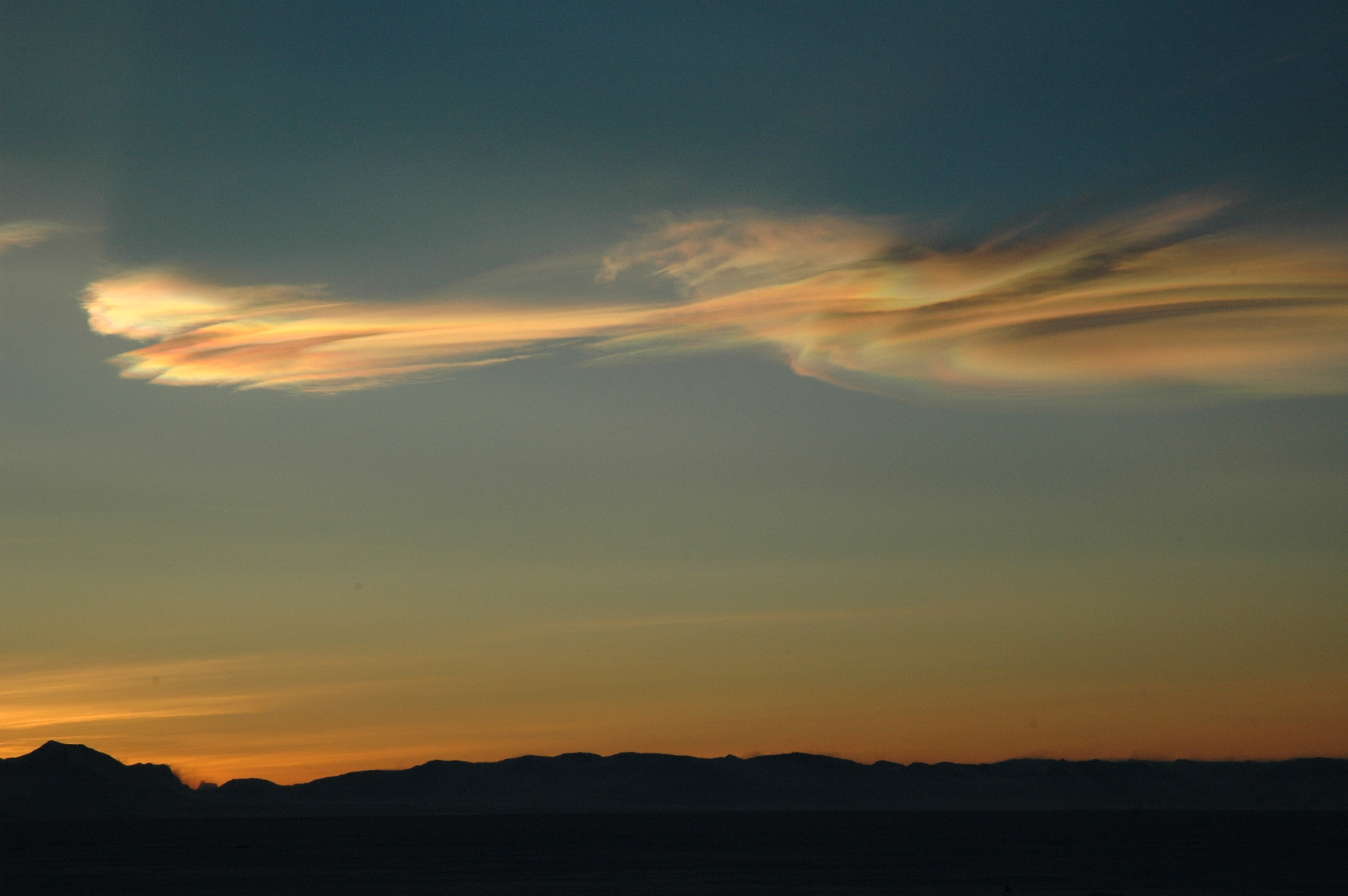 Nacreous clouds during sunrise. McMurdo Station, Antarctica.