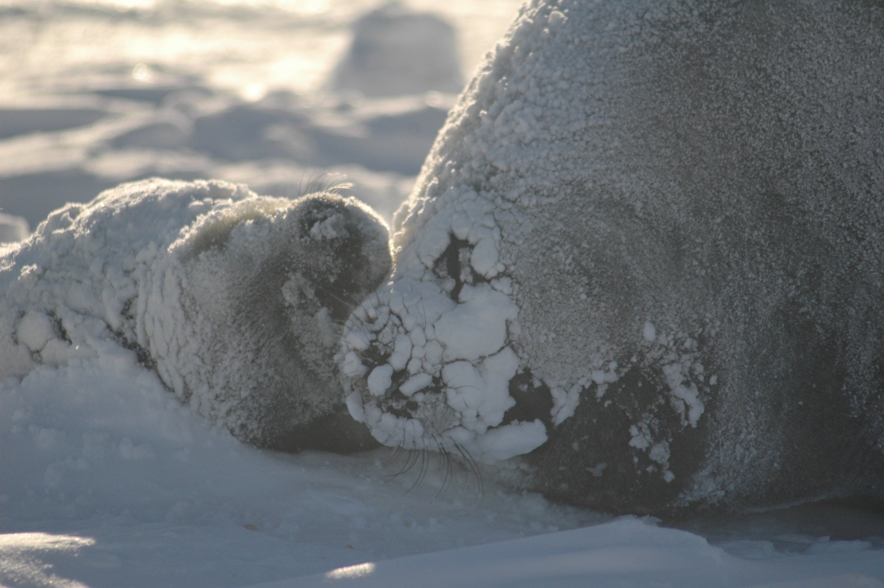 Michael League: "This was an amazing sight. A seal pup snuggling against its mother in difficult weather conditions." McMurdo Station, Antarctica.
