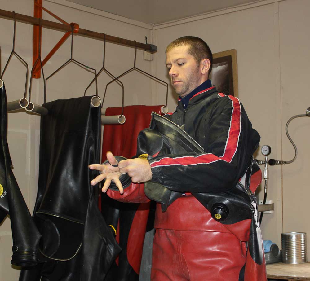 Michael League prepares for a dive in the Dive Locker. McMurdo Station, Antarctica.