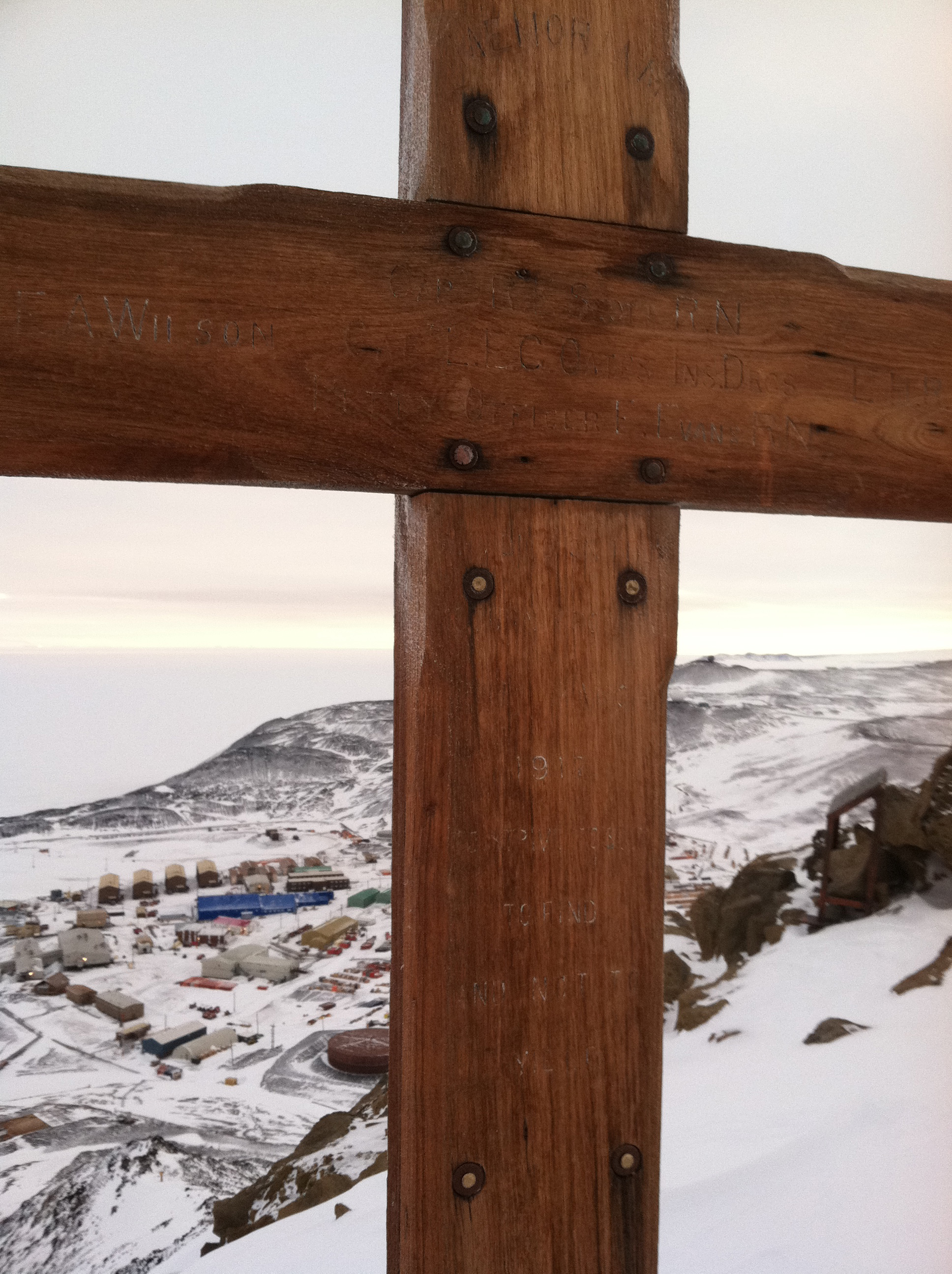 The writing on the memorial cross (erected by the relief crew in 1913) is hard to read. It lists the names of Scott's party, and the final line Alfred Tennyson's poem "Ulysses", which reads: "To strive, to seek, to find, and not to yield." McMurdo Station, Antarctica.