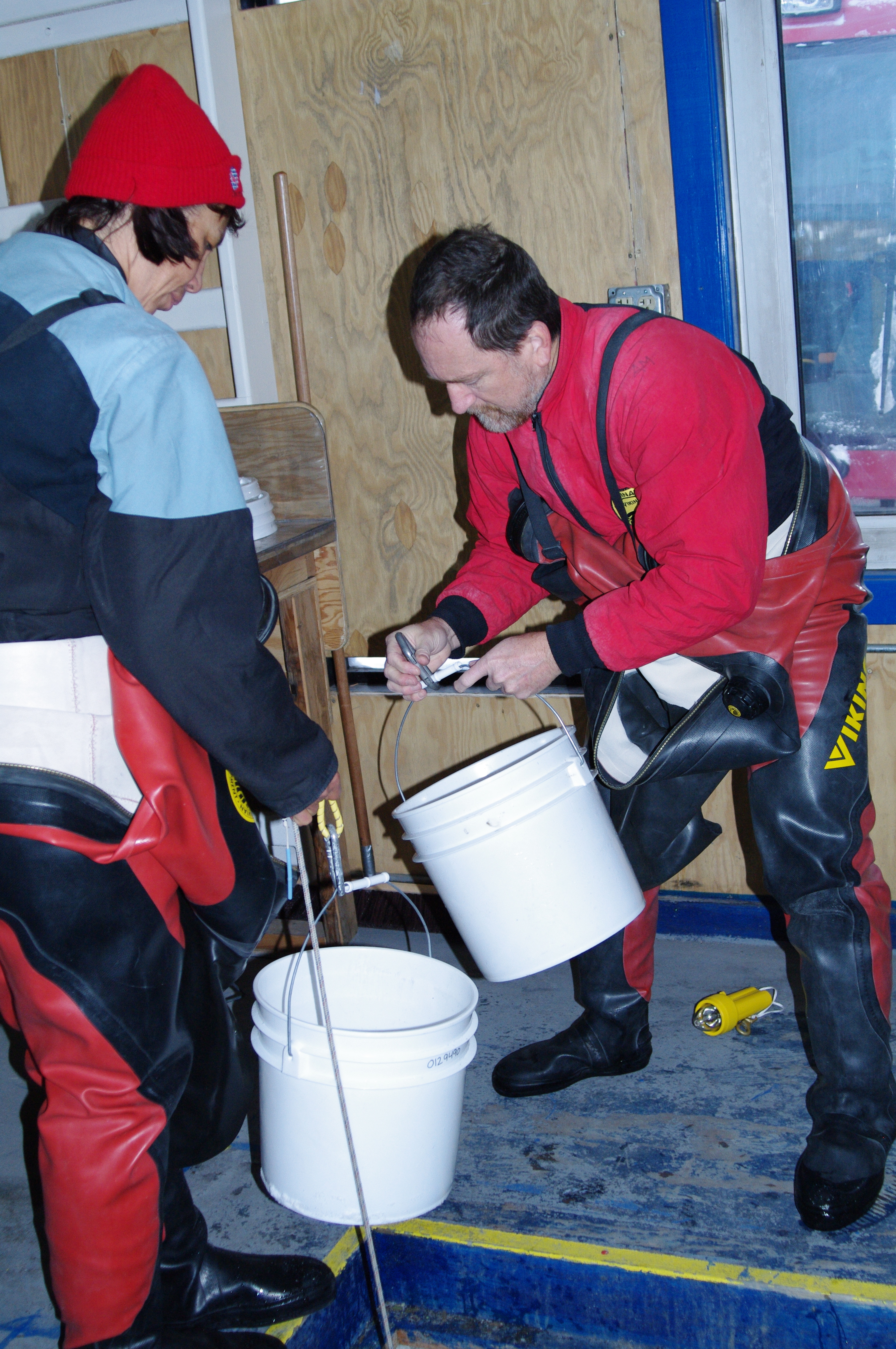 Dr. Adam Marsh and Dr. Stacy Kim attach the equipment to the down-line. McMurdo Station, Antarctica.