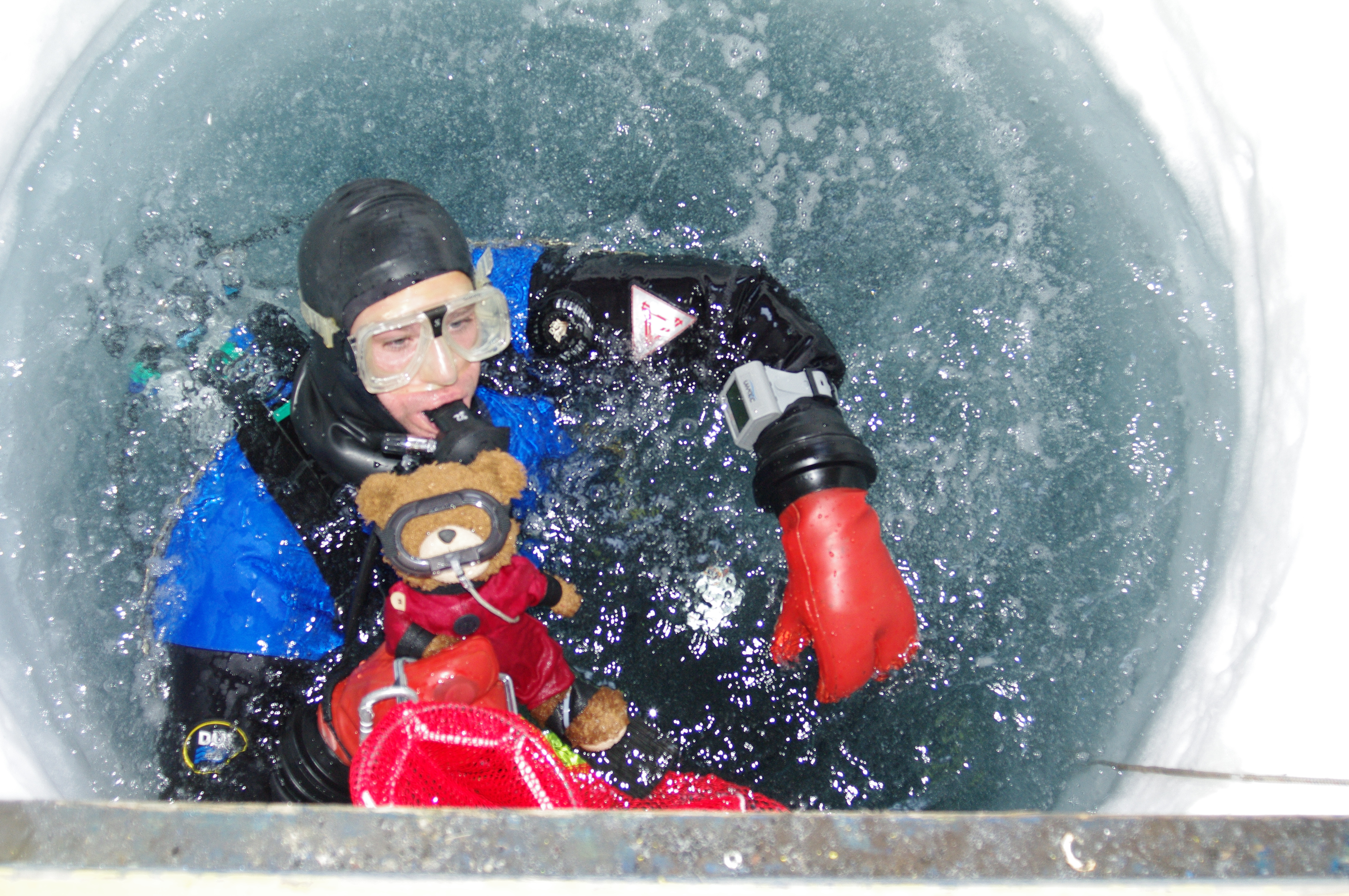 Theodore and Michael League pause in the dive hole for a photo op. McMurdo Station, Antarctica.