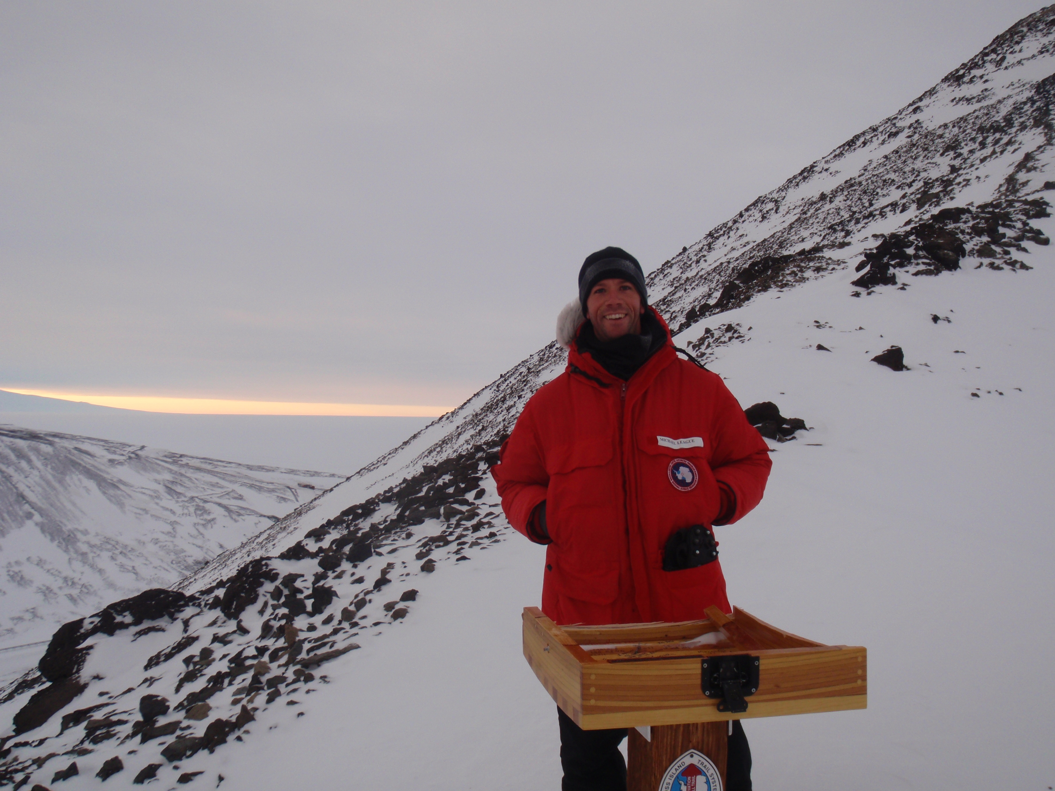 Michael League on Observation Hill during a hike with Dr. Stacy Kim. McMurdo Station, Antarctica.