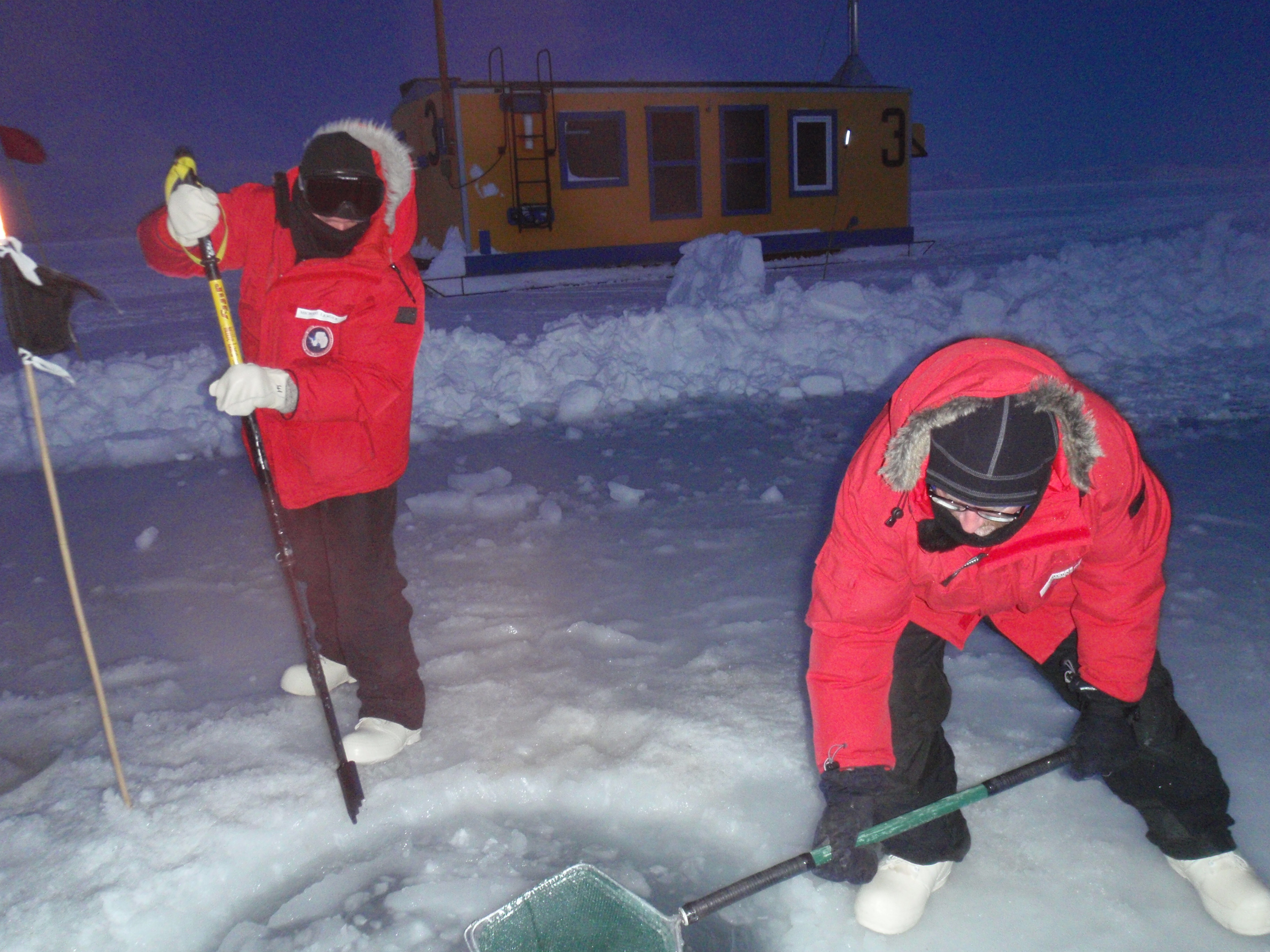 Michael League and Dr. Adam Marsh clear out the dive hole before the dive hut is dragged into place over the hole. McMurdo Station, Antarctica.