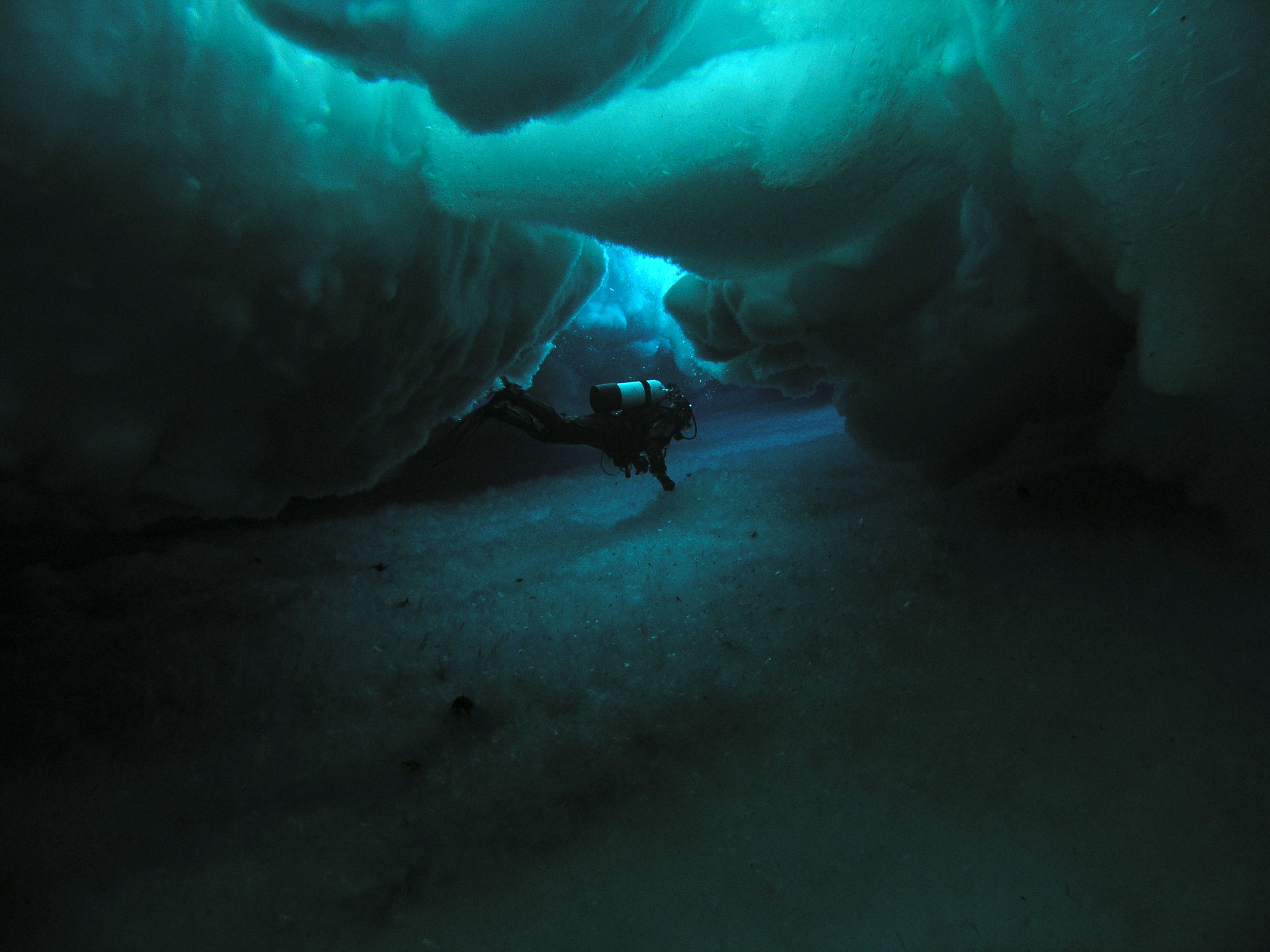 Dr. Adam Marsh explores the anchor ice within an ice tunnel. McMurdo Station, Antarctica.