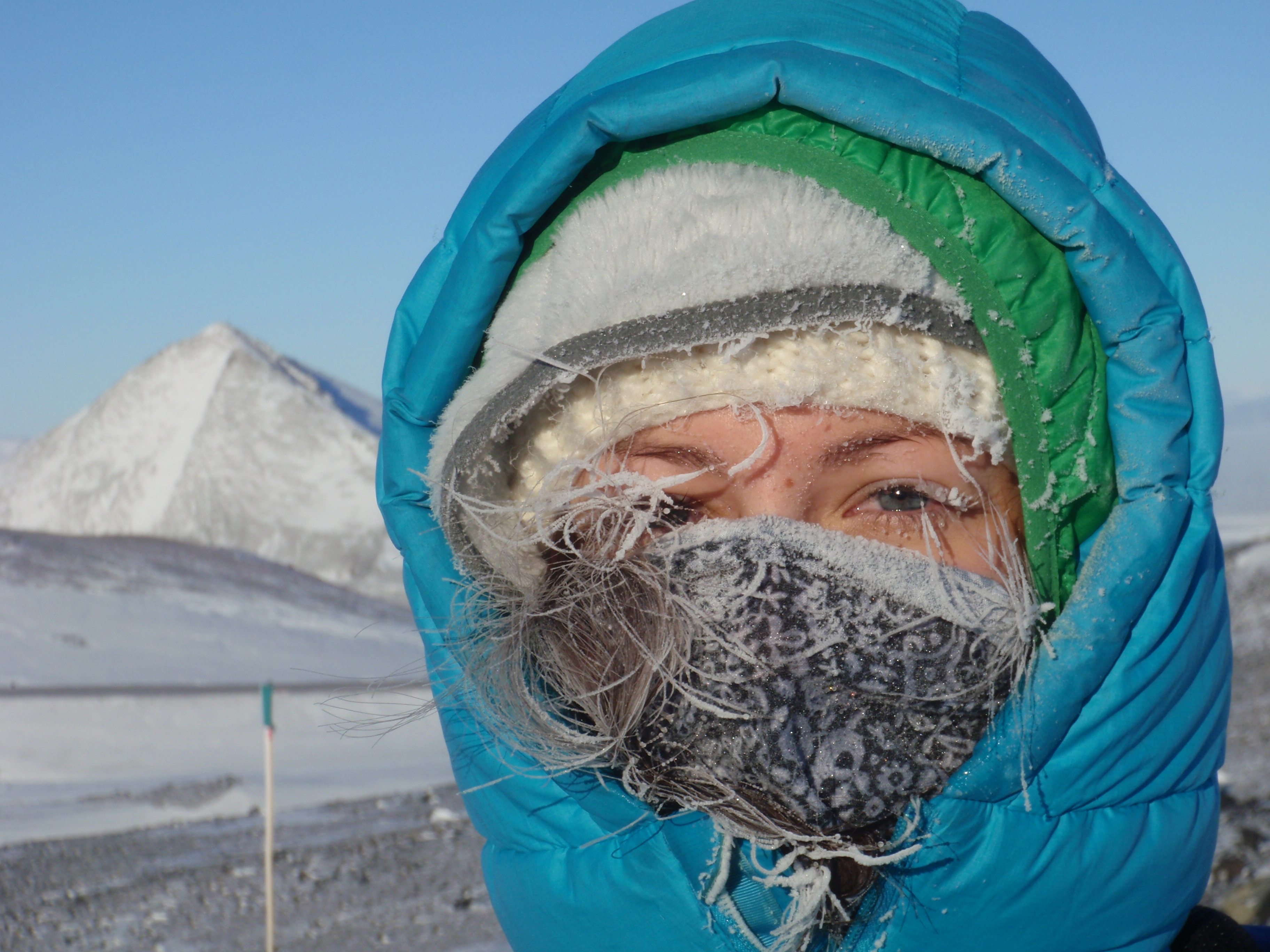 Researcher Stephanie Guida's face gets frosty from the cold. McMurdo Station, Antarctica.