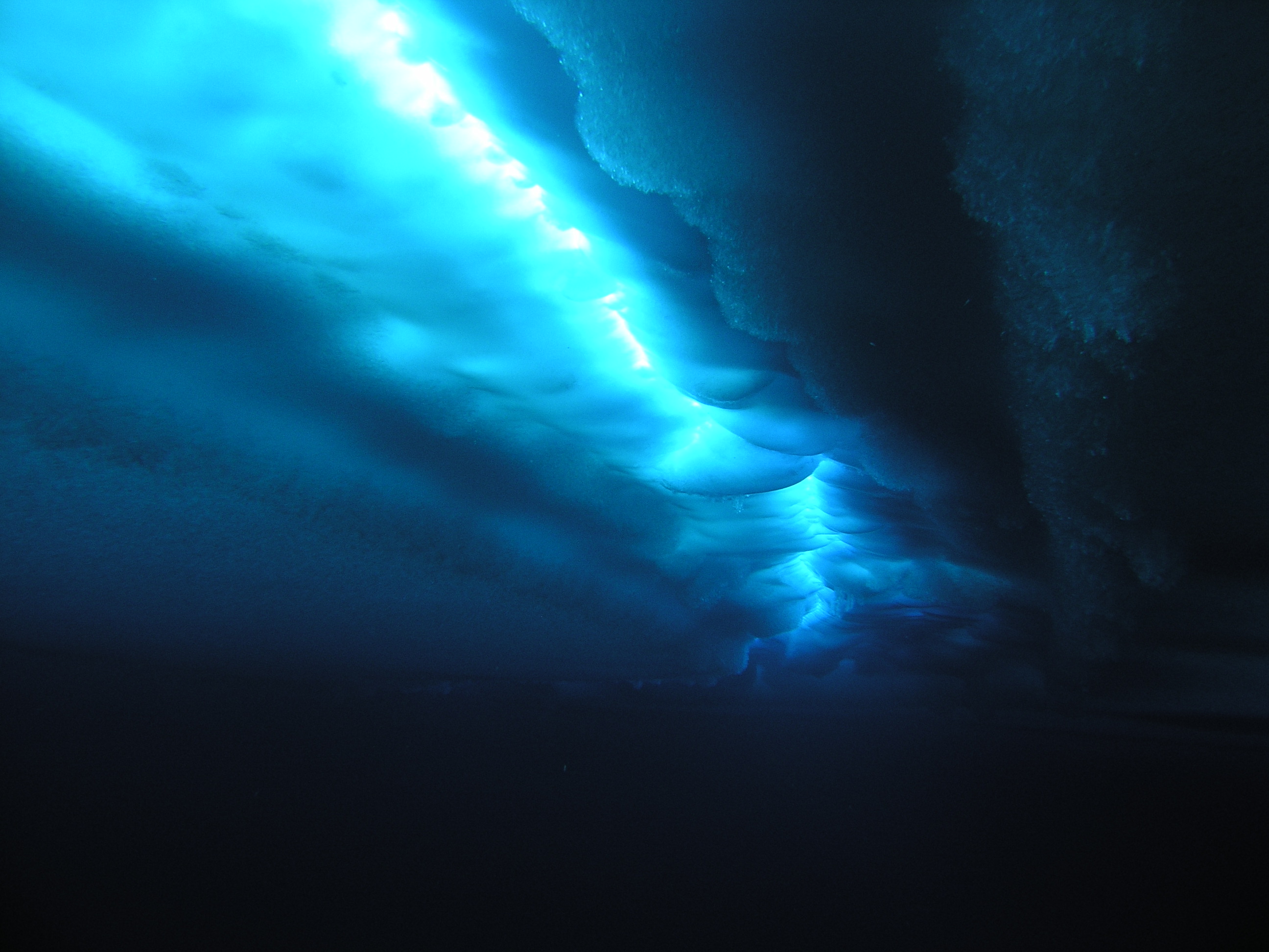 A sea ice crack as seen from under the sea ice. McMurdo Station, Antarctica.
